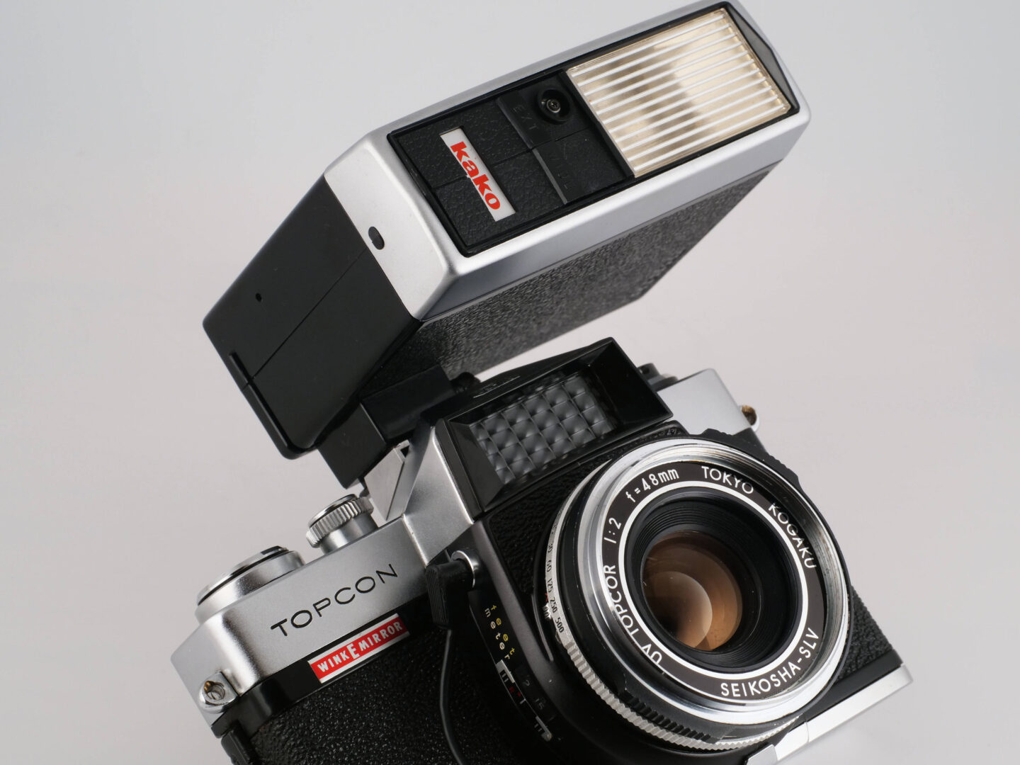 劇中で糸子は望遠レンズを装着したペンタックス SVで、南洋の孤島から日本に連れ去ってきたガッパの子供のアップを撮影し、それを表紙にした『プレイメイト』増刊号は飛ぶように売れました。フレーミングとピント合わせにおいて、長焦点レンズでの撮影にメリットがあるレンズ交換式の一眼レフであるペンタックスを使用したのは理にかなっています。それではウインクミラーEとどのような使い分けをしていたのか? その答えはフラッシュ撮影にありました。レンズシャッターであれば最高速の1/500秒でもフラッシュと同調し、日中シンクロ撮影にも有利です。実際に劇中のプロップとして、大袈裟なグリップ付きの業務用フラッシュを装着した本機をぶら下げている糸子を観ることができます。