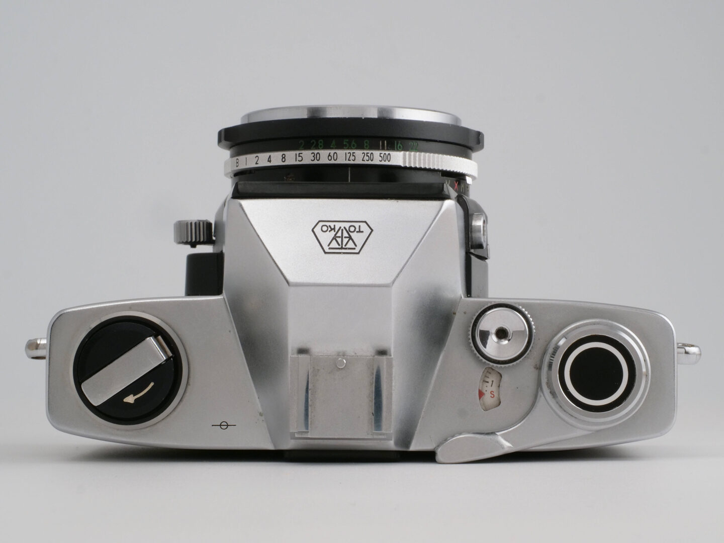 デッキで直射日光を浴びているカメラは実は2台あって、もうひとつは望遠レンズを装着した旭光学のペンタックス SVなのですが今回はトプコン ウインクミラーEを取り上げさせていただきます。本機の発売は1961年。旧帝国陸軍の光学兵器を製造していたことでも知られる東京光学(ちなみに海軍は日本光学ですね)の製品です。映画の小道具として使用されている機種が特定できたのは、ペンタプリズムのオデコに東京光学のロゴマークがあったから。本機を真上から見るとペンタプリズムを収納した部分が大きい割にはボディが小ぶりな印象なのは、シャッター速度ダイヤルが軍艦部に存在しないことが要因です。