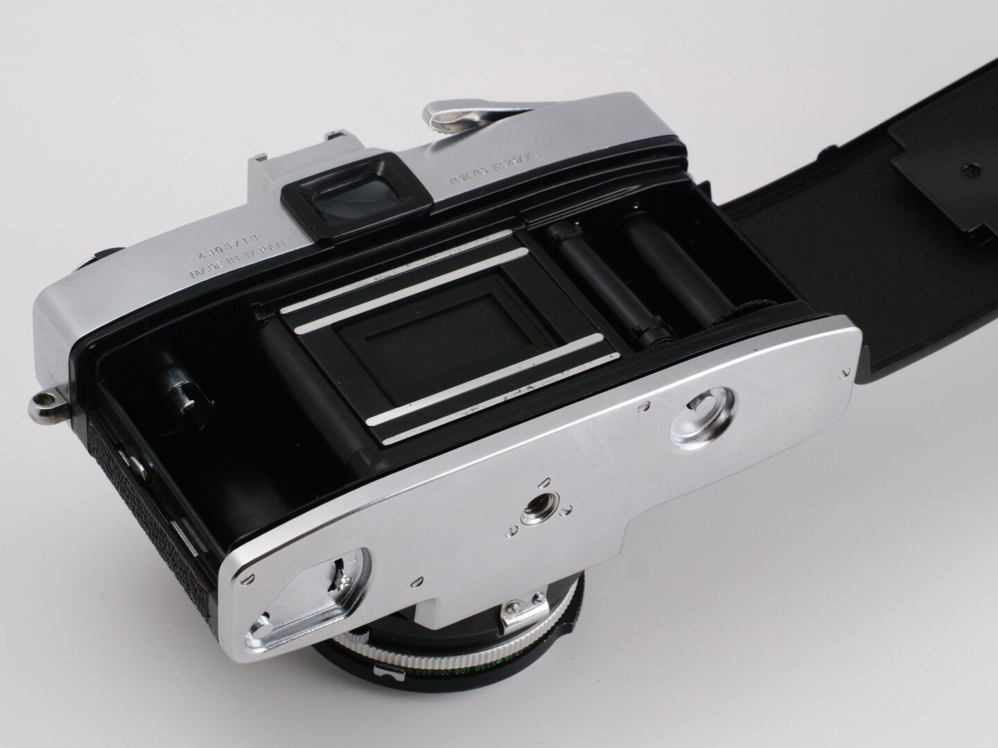 トプコンのカメラって裏蓋の開け方が独特なものが多いのですが、本機の場合も然り。底蓋の小さなノッチをLからOに動かして、小さなボタンをポチッとするとパカっと裏蓋が開きます。そうするとフィルムに露光させる面が見えるのですが、24×36ミリのライカ判で空けられた四角い枠の中に、さらに額縁状に黒い艶消しの枠と板が見えます。これは通常のフォーカルプレーンシャッターではなく遮光版なのです。一眼レフのミラーがフォーカシングスクリーンの方に上昇する動きと連動して、この遮光版は底蓋方向に回避していく仕掛けです。