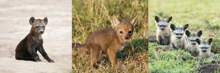 サバンナの代表的な大型ネコ科3種類の他にも肉食動物がいます。ここでクイズです。次の写真は肉食動物の赤ちゃんです。それぞれ、なんの動物の赤ちゃんでしょう。