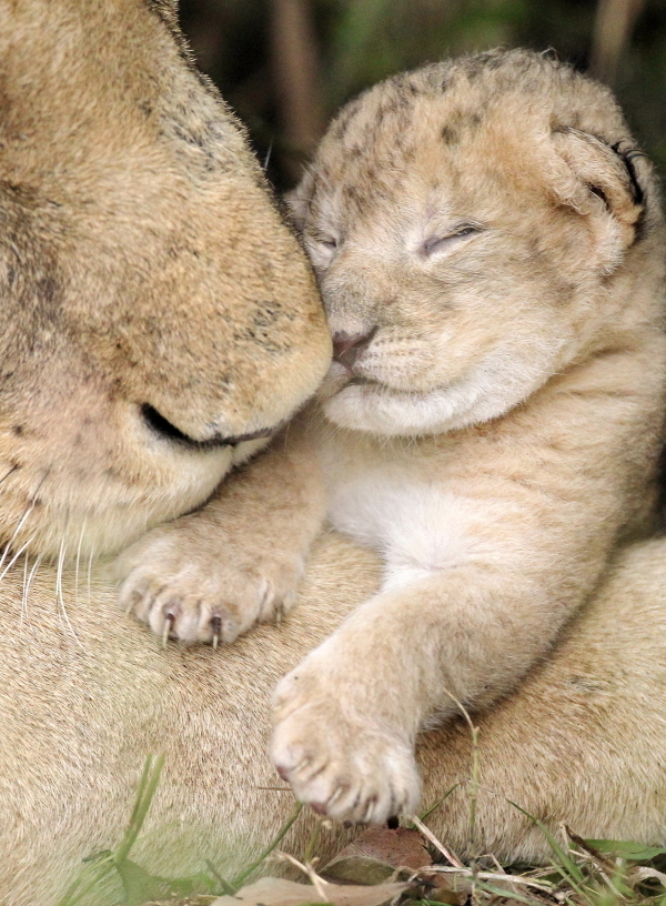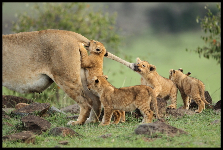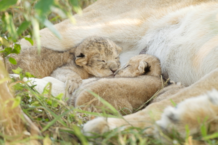 ライオンはプライドという家族的なグループで行動をします。そのプライドでは、同じ時期に複数のメスライオンから子ライオンが生まれることがよくあり、1頭のお母さんからは多いと4〜5頭生まれるようです。同じタイミングで2頭のお母さんから計9頭の赤ちゃんがいる場面に出合ったことがります。生後2ヶ月くらいでしたがまだミルクを飲みます。2頭のお母さんが同時に赤ちゃんたちにミルクをあげていました。そのうち1頭の赤ちゃんがとなりのお母さんのところに行きそちらでもミルクを飲み始めました。ライオンはプライド内では共同で子育てをする事がよく分かる瞬間でした。