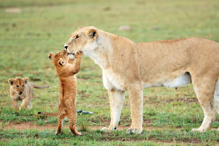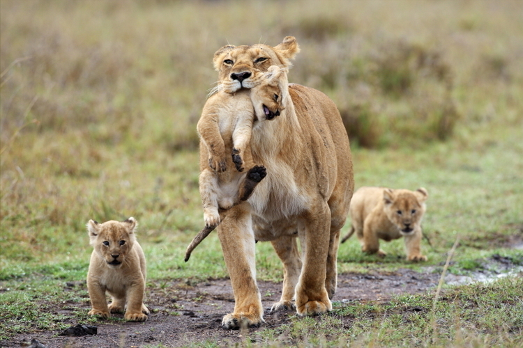 生まれて間もなくは、親ライオンはとても警戒していて、他の肉食動物に見つからないようにねぐらを何度も引越しをします。一箇所に長くいると匂いで見つかってしまうと言われています。その時、まだ歩けなかったり、歩くのが遅い子ライオンを口にくわえて引越しをします。この場面は当初からぜひ撮りたい場面でしたが、私が初めて見られたのはケニアに通いだして17回目の時でした。