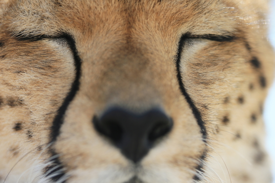 チーターとヒョウの違いを説明します。一番簡単に見分けられるのが顔です。チーターは目元から口にかけて黒い涙線とも言われる模様があります。これは、生まれた時から付いているので赤ちゃんチーターでも見られます。チーターは比較的クルマを怖がりません。かなり近くまで来てくれることもあります。たまに、クルマの日陰に入ってくることもあります。超望遠レンズでは、最短撮影距離内でピントが合わないこともあります。あるとき、チーターが車の脇でじっとしていたのでエクステンションチューブ(中間リング)を使って顔の接写なんてことも経験があります。