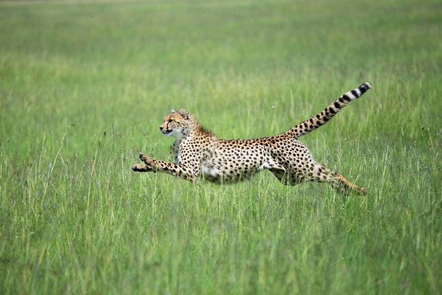 さらに見慣れてくると違いがわかるのがシルエットです。つまり体型ですが、チーターは陸上最速で走る哺乳類と言われているほど走るために進化した動物です。空気抵抗を少なくするために顔は小さく体はスリムに、足は細くて長いです。それに比べてヒョウは獲物を仕留めるのに有効な噛む力が強くなるように顔が大きく、木の上での生活で有利になるように足は短く太いです。どちらも尻尾は長く、チーターは高速で走っている時の舵取りのためで、ヒョウは樹上でのバランスを取るためのようです。