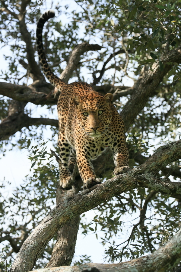 夕方に戻ってくるだろうけど、日没までに戻ってくるだろうか。日没までに終了し、宿に帰るのが国立公園のルールです。本当に今日戻ってくるのか、などドライバーともディスカッションします。相手が動物ですから絶対はないので、当たっても外れても、それがサファリ!と楽しめれば良いのです。そして、狙い通りにヒョウが戻ってきたら、夢中でシャッターを切りながら知らずのうちに顔がにんまりしてしまうのでした。ヒョウが木に登る時間は数秒です。被写体ブレしないように1/1000秒以上に設定して2時間弱待っていました。