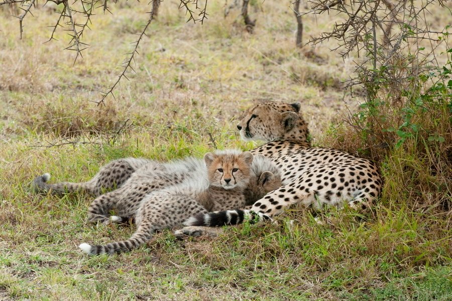 チーターの赤ちゃんは生まれて間もない頃は背中にたてがみのような白っぽい産毛が生えています。草原でカムフラージュになるようです。成長するとともに産毛はなくなっていきます。チーターは多いと8頭の赤ちゃんが生まれます。乳首の数が8つあります。私が見た中で最大なのは7頭の赤ちゃん連れでした。それが全て成長することはほとんどないでしょう。他の肉食動物に狙われた時に全員を守れないからです。