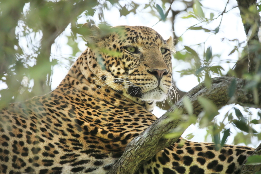 ヒョウは日中は木の上で昼寝をしているところをよく見かけます。昼寝をしているヒョウを見つけて、そのヒョウが動き出すのを待つか、他を探しに行くかという葛藤になります。ヒョウがすぐ動き出すかもしれないし、何時間も動かないかもしれない。他に行けば何か見つかるかもしれないし、そのヒョウを撮り逃すかもしれない。そこにヒョウがいるときはまだ良いのですが、フレッシュな獲物が木の上にさがっているところを見つけた場合、きっとその獲物を食べに戻ってくるという判断をする場面です。