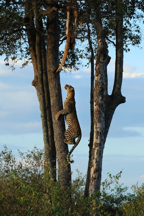 ヒョウは木登りの名人です。大型ネコ科3種類の中で木登りを得意とするのはヒョウだけです。狩をした得物を口にくわえて木に登ります。大きすぎる得物を狩ってしまったときは地上で半部くらい食べてから、残りを樹上にあげます。樹上は他の肉食動物が来られないので、横取りされることはないヒョウにとっての安全地帯なのです。子育ても木の上でします。小さい時から木登りをしているので得意なわけです。また、お母さんが狩に行くときも赤ちゃんは樹上で待つので他の肉食動物に襲われる心配が少ないです。ただ、大型の猛禽類やどう猛なサルの仲間のバブーンなどは要注意です。バブーンは大人のヒョウでもよく追いかけ回しています。