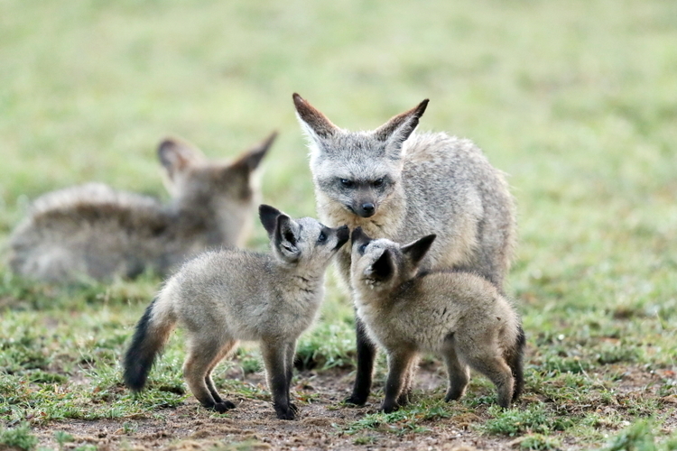 オオミミギツネは草原を素速く走って逃げていく姿をよく見かけます。そんなに逃げなくてもいいのにと思うほど逃げます。そして遠くで振り返ります。しかし、たまに逃げずに車の近くで遊んでくれることもあります。気分屋なのでしょうか。赤ちゃんがいる巣では近づくことができませんので遠くから超望遠レンズで狙います。警戒している限り親は帰ってこないし、赤ちゃんも巣から出てきません。じっと待ちます。クイズの右の写真の答えです。
