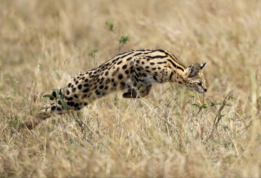サーバルは小さいチーターのようにも見えます。模様はキングチーターにも似ています。草原でじっとしているところを見かけます。地中のネズミが動く音を聞き分け、一気に飛びかかります。その瞬間を撮影しようと構えたまま何十分もじっとしていることもあります。鼻が痒くなって一瞬目を離した瞬間にジャンプして撮り逃がしたこともあります。また、アップで狙おうと画面いっぱいにフレーミングしていたら、高くジャンプすることを想定していなくてジャンプとともに画面から消えてしまったこともあります。とにかくサーバルの動きは速く、1/1000秒でも被写体ブレをします。