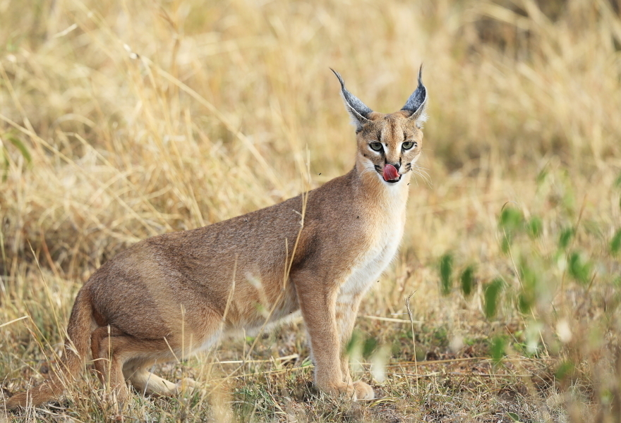 リカオン並みに希少なのがカラカルです。日中滅多に出てこないのでこちらも過去に2回だけしか合っていません。2回目に会ったときは、ドライバーが友人から情報をもらい、1時間以上離れた場所に移動して会えたものでした。その間にいなくなってしまうかもしれませんがそれでもいく価値があると判断しました。カラカルは耳の先に長い毛がありオオヤマネコのような顔立ちです。鳥などを捕食する際に3メートルの高さまでジャンプすることで有名です。