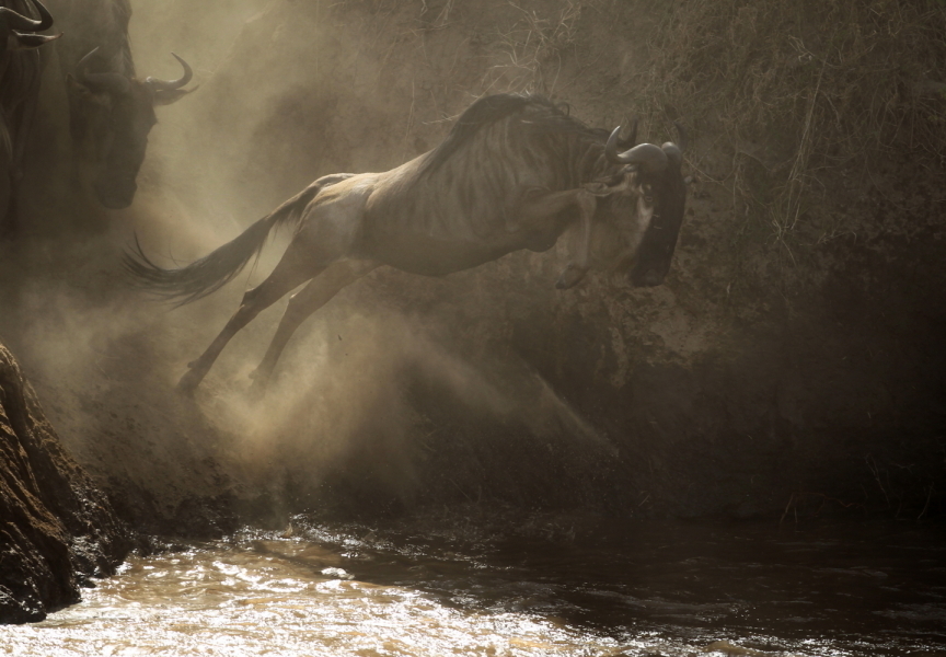 川渡りの撮影は、ポジションにもよりますが、ある程度のアップで狙うには500ミリ以上の超望遠が必要になります。1.4倍や2倍のエクステンダーを使うこともあります。大きな渡りの時は、全体切り取ることもありますので、16-35ミリのような超広角から100−400のような望遠ズームもよく使います。前にも少し述べましたが、超望遠レンズでヌーがジャンプをする場面では、1/1600秒以上でないとブレてしまうのである程度は動きに合わせてレンズを振りながら撮ります。光線は時間帯や川の流れの角度によって、変わりますが、逆光のところでは水しぶきを狙うと迫力が出ます。順光では、より高速シャッターで動きを止めやすくなります。対岸から手前の方まで見渡せるポジションであれば、短いレンズで、川の流れとそれに逆らいながら泳ぐようなヌーの列がラインに見えるように狙います。その時に対岸に車が映ったりしなように画面の四隅も確認しながら切り取ります。