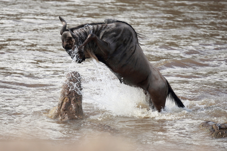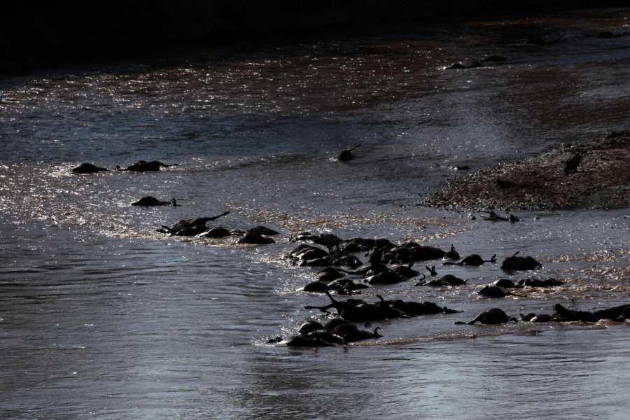 マラ川はその年や、直前の雨量によって水位が大きく変動します。水量が少ない時は、ヌーの膝くらいまでの流れの中を簡単に渡っていくのですが、通常や水量が多い時は、水面から顔だけ出して泳がなければなりません。川幅はそれほど広くはなく50メートル〜100メートルくらいです。しかし、長い時間をかけて流れで削られ、水面は周囲より低いところを流れ、川岸は崖の様になっています。深いところでは10メートルくらいの急な崖で、そこを落ちる様に下っていくこともあります。その時に足を怪我してしまい、泳げず溺れてしまったり、川の中で待ち構えているワニに捕まってしまうこともあります。