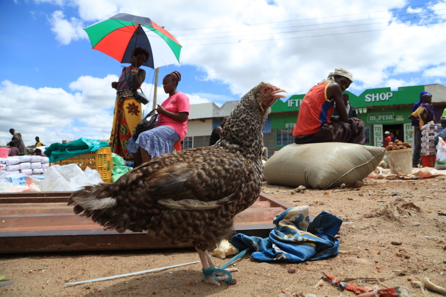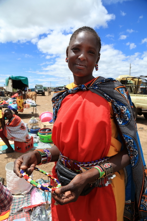 マサイ族の女性が手作りする装飾品に使うカラフルなビーズや、生きた食用のニワトリもいます。私が市場で買うのはマサイクロスやブランケットと言われるチェック柄の布です。赤色系が多いのですが最近では青や黄色のものもあります。寒い時はこれを巻くとかなり暖かく、日本でも自宅のソファーや車にも数枚積んであります。