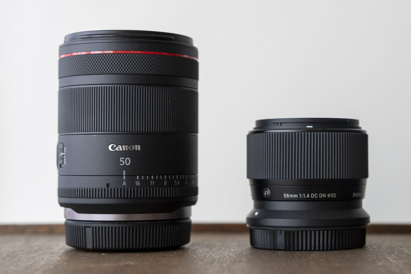 開放F値が同じで焦点距離が近いキヤノンの「RF50mm F1.4 L VCM」とシグマの「56mm F1.4 DC DN|Contemporary」の大きさを比較してみました。