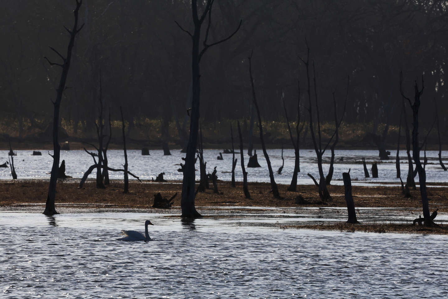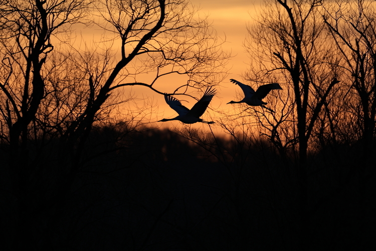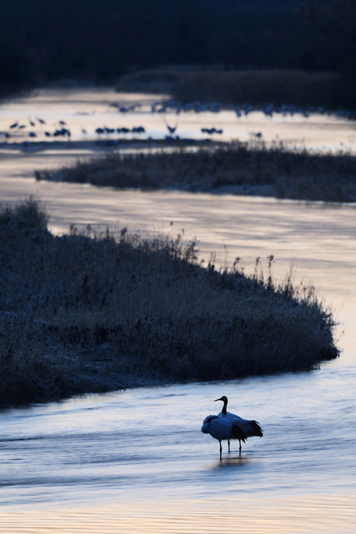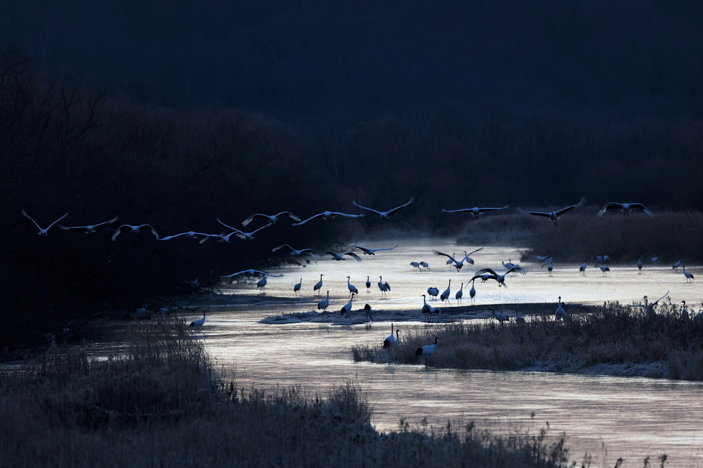 日の出前の気温はマイナス8度くらい。肉眼ではなかなか確認できない薄暗いところもEF500mm F4L IS II USMにマウント変換アダプターを使いEOS R3を装着し、静止画測距輝度範囲EV-7.5とは言え、暗すぎてAFでは合わせられない状況でも撮影は始まります。ピントさえ合わせられれば長時間露光で撮影ができます。感度を高くしてファインダーで被写体が薄らでも見えれば、拡大表示してマニュアルフォーカスで合焦後、30秒以内で撮影できる範囲まで感度を下げて撮影します。徐々に明るくなってくるので、露出を調整し、タンチョウが動き出したら、タンチョウがブレないように高感度になってもシャッター速度を速くします。最低でも1/125秒できれば1/250秒、飛翔の場面ではできれば1/1000秒以上が理想です。