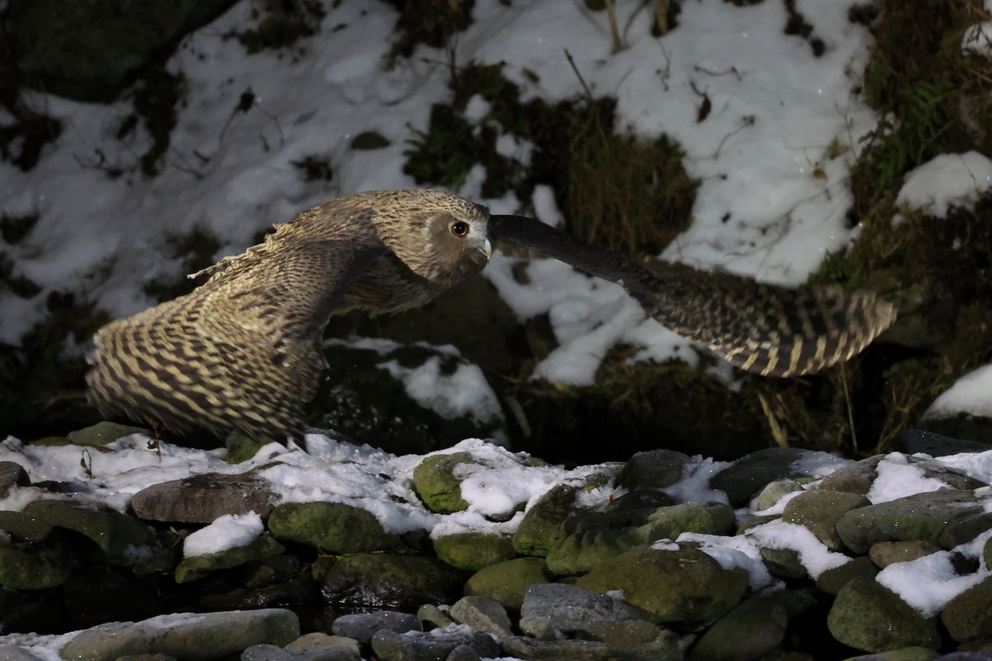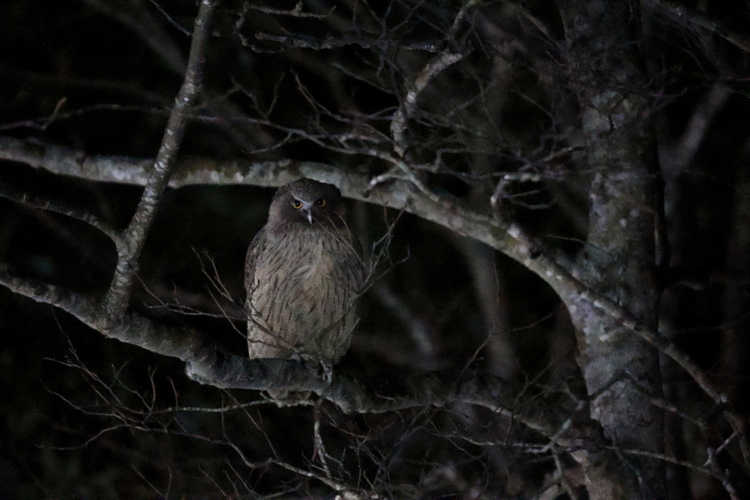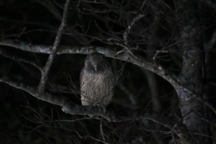 羅臼の宿の前の川にやってくるシマフクロウの撮影では、通常魚のいるところでは照明が当てられているので、指定された設定でちょうど良い明るさに写せるのですが、そこから少しでもズレた場所は暗くなっていて10mも離れたところでは、目を凝らしてじっくり見ないと被写体が確認できないくらい暗いところに留まることもよくあります。