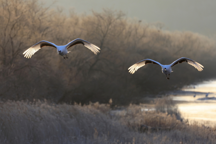 タンチョウがこちらに向かって飛んでくる場面は、翼や脚を追従してしまうなどAFが苦手とする状況ですが、EOS R3ではかなりの確率でタンチョウの頭をトラッキングしてくれます。今までは任意のAFフレーム1点でタンチョウの頭に重ね合わせながらフレーミングするのは難しかったのですが、視線入力と瞳AFの設定でタンチョウの頭をトラッキングさせられるので、タンチョウの頭にフレームを誘導できれば後は構図に集中できます。