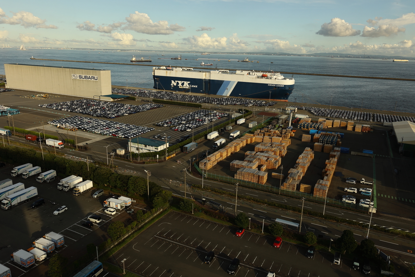 こちらの港風景の写真は、キットレンズのRF24-105mm F4-7.1 IS STMを使用して高層ビルから撮影しています。コンテナに積まれるのを待つ自動車や手前の木材の細かな部分まで描写されており、非常に高精細であることが確認できます。