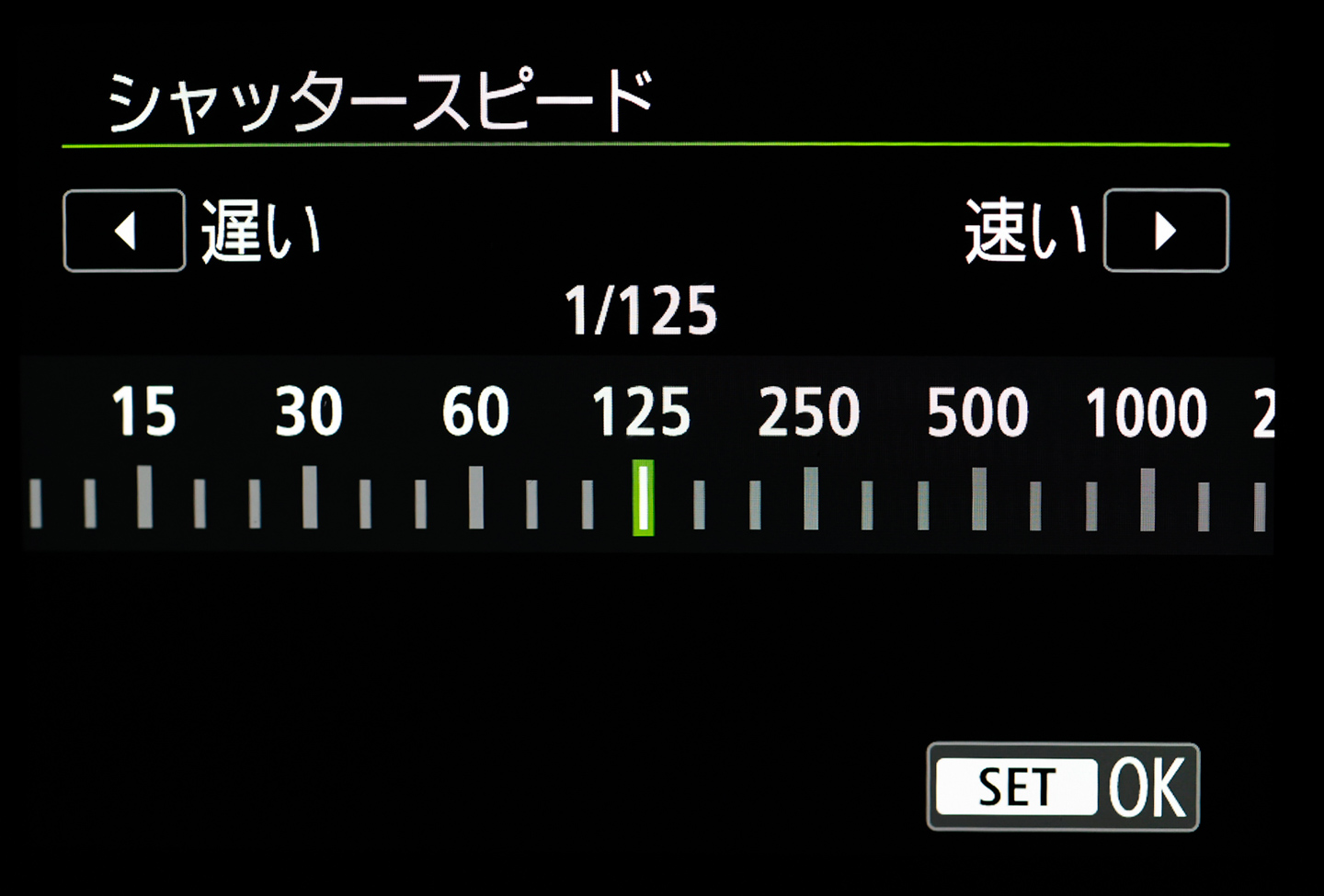 例:1/2000秒・F8・ISO6400が通常撮影の数値とすると、低感度時の数値の1/125秒・F5.6・ISO200