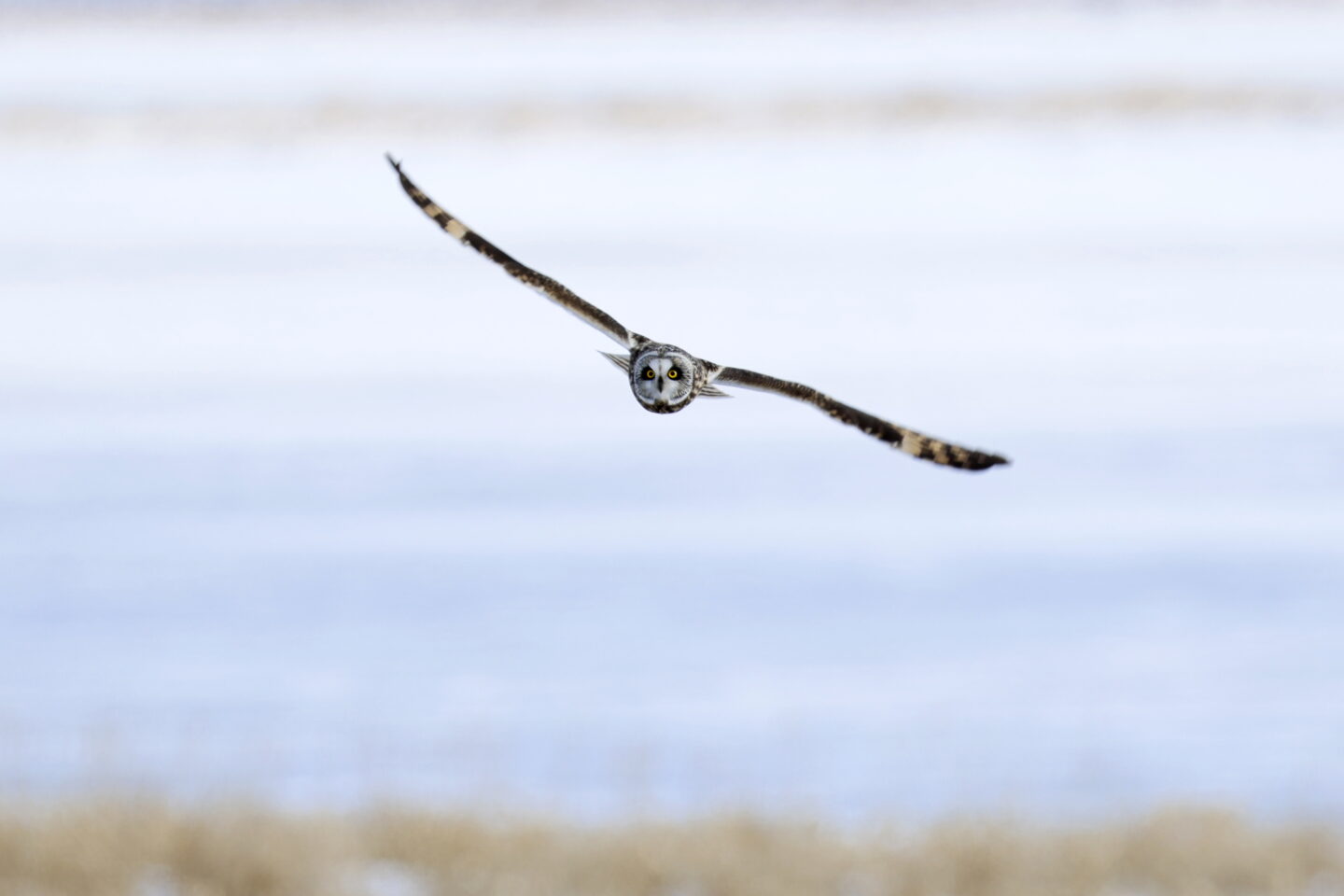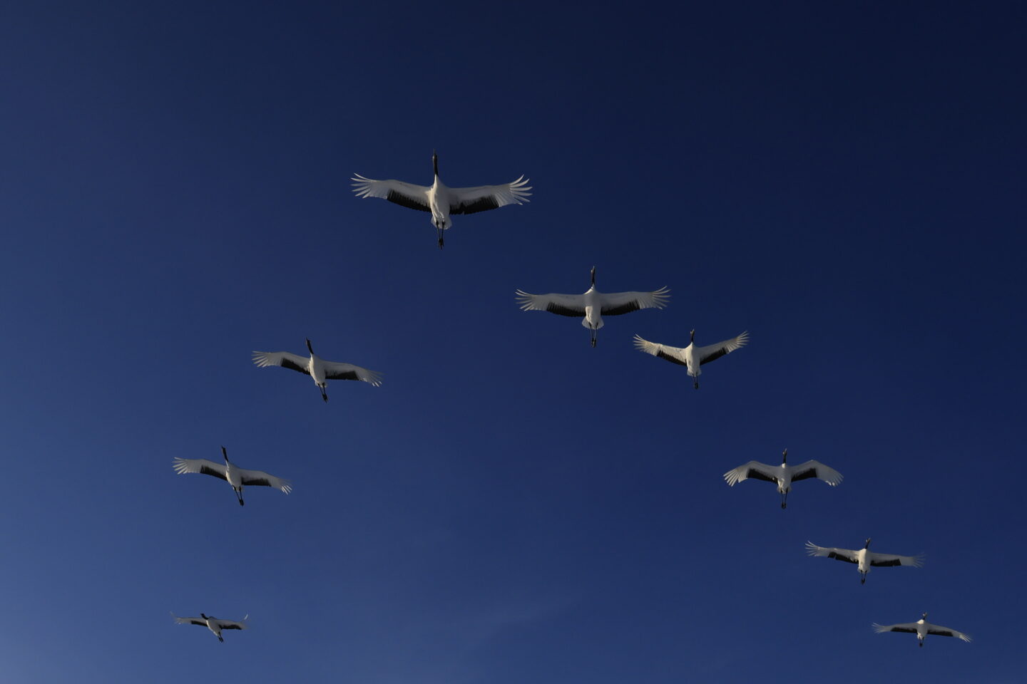 ねぐらに戻るタンチョウが頭上を通過する姿を狙う。鳥自体が大きくかなり低い位置を飛ぶのでレンズをズームしながら撮影したが、AFトラッキングはズーミングをしていてもしっかりとピントを追い、合わせ続けた。