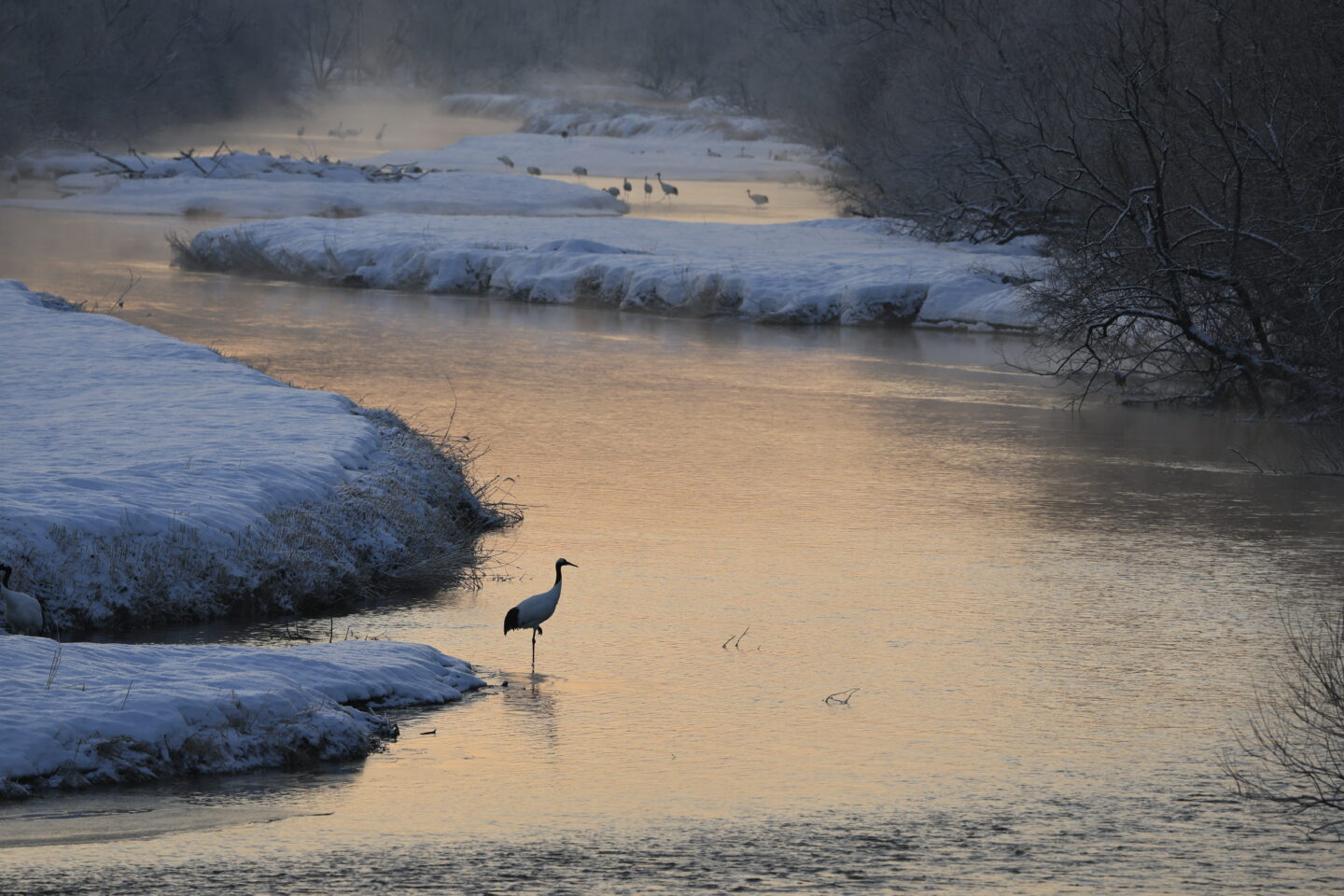 この朝は気温も下がらず、太陽も出ないし気嵐も上がらず「終わったな」と思っていたが撮影を切り上げる寸前、東の空が明るくなり川面を染めた。レンズをタンチョウに向けると全域AFは素早くタンチョウの姿を捉えた。露出は若干アンダーにして川面の色を活かした。