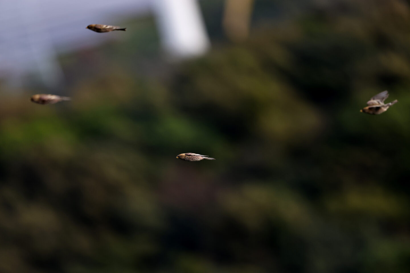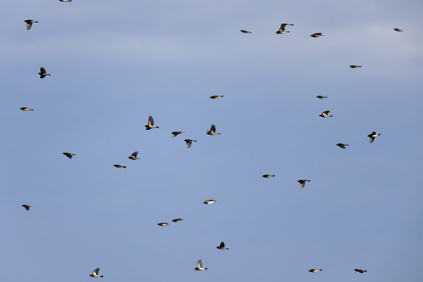 空バックで飛翔する小鳥の群れを撮るコツは、あるポイントにピントを合せておく「置きピン」が有効になる。空でピントを合せると斜面でもかなりの確率でAFトラッキングは追い続けてくれるが、逆光や半逆光のバックの反射でファインダーが見えづらくなる。そんな中でもピントを追い続けるAFトラッキングに驚かされる。