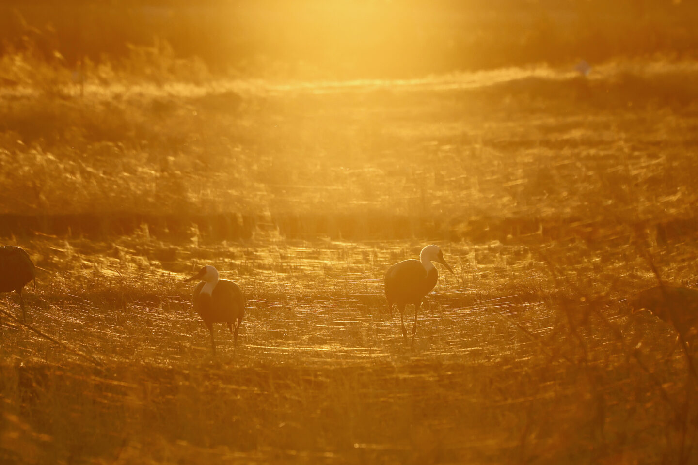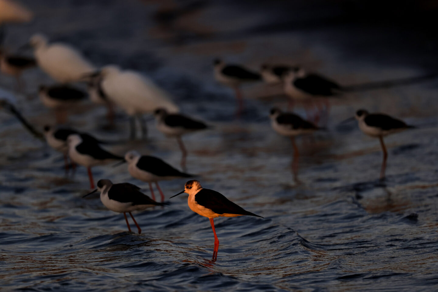 夕陽が手前のセイタカシギにだけ当たると赤く輝いた。プリ連続撮影がメインな撮影だったが、この頃はまだ「呼び出し」を設定していなかった。高速シャッタースピード・高ISO・高速連続撮影+だったが、設定を変えている時間が無いのでそのまま撮影した。しかし高感度に強いカメラなので美しい画像を得ることができた。