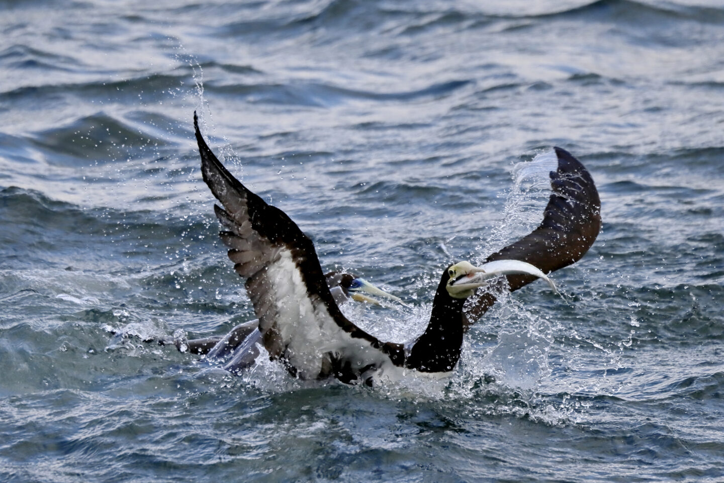 カツオドリが海に飛び込む時は進行方向や風向きをチェックしておき「どちらに飛び出すか?」を予想する。飛び込んだ水しぶきにピントを合わせ「置きピン」した後、シャッターから指を離して待つ。水面の色が変わった瞬間シャッターボタンを半押しするとすぐにピントを合せる。飛び上がった瞬間シャッターを切るがプリ連続撮影はシャッターを切る前から記録をしているのでこんなシーンを撮ることができる。