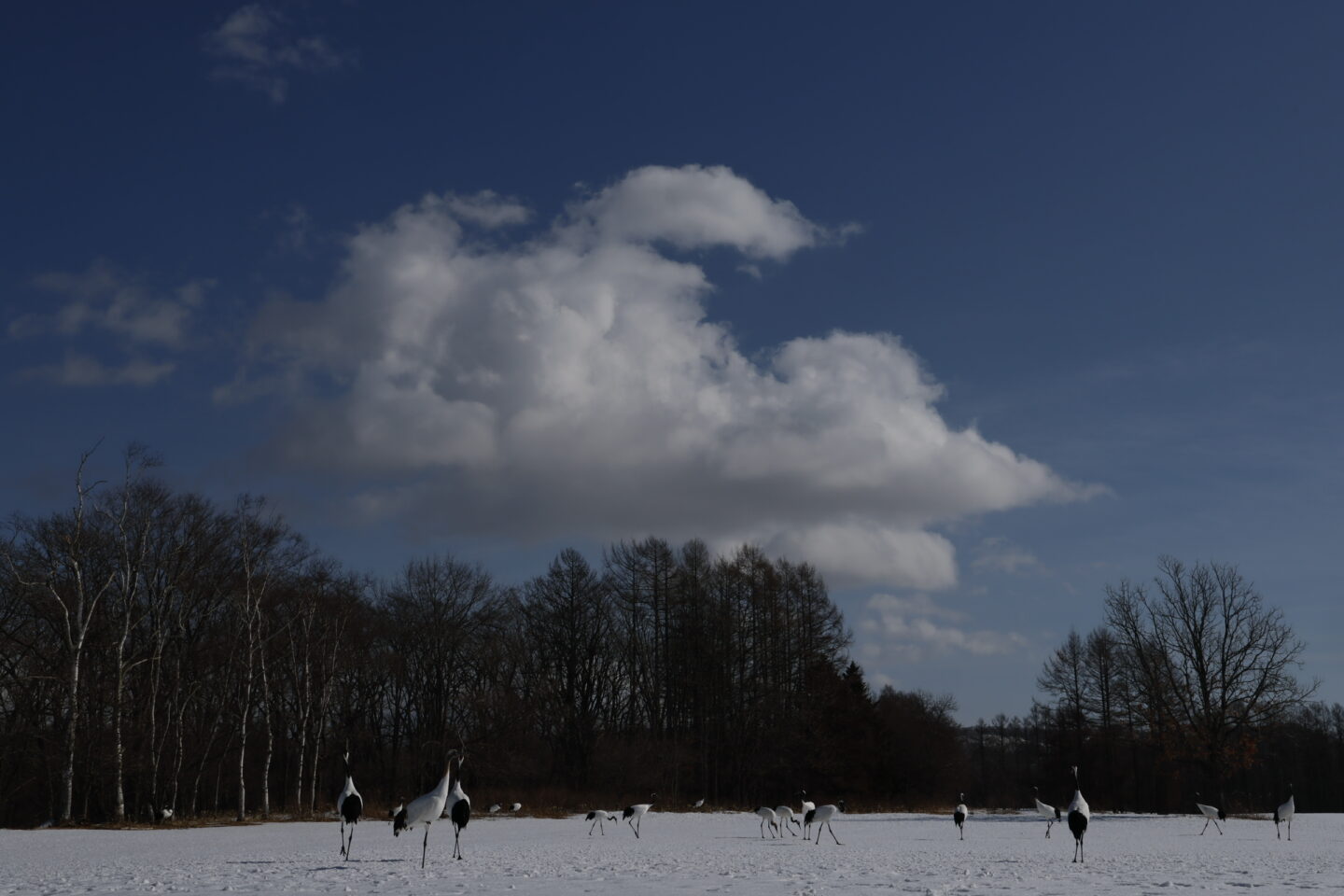 伊藤タンチョウサンクチュアリではタンチョウが近くにいる+青空+いい雲が出ている午前中は、必ず柵の下からローアングルで広角寄りのズームを使用して撮影する事にしている。全域AFでも大丈夫だと思うが、領域拡大AF上下左右や周囲で手前のタンチョウにピントを合わせて撮影すると失敗が少ない。