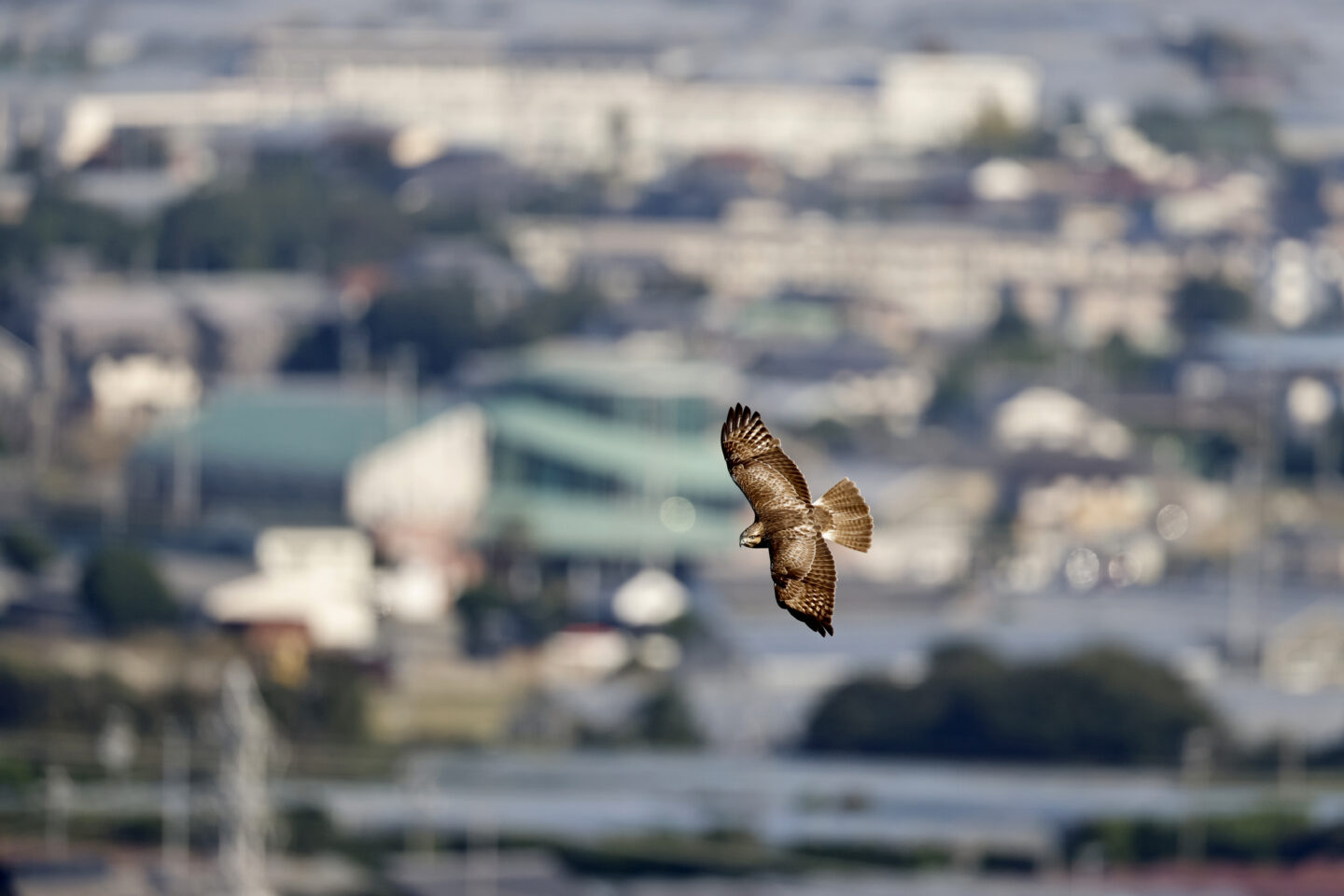 市街地をバックに飛翔するノスリ。以前はこのようなシーンであればAFはバックの街並みにピントをとられてノスリに合わせることはなかったが、EOS R6 Mark IIIは飛翔速度にもよるが、かなりの確率でピントを合わせてくれる。空で捉えたあと斜面や市街地バックに入ってもほとんどピントを外さない。