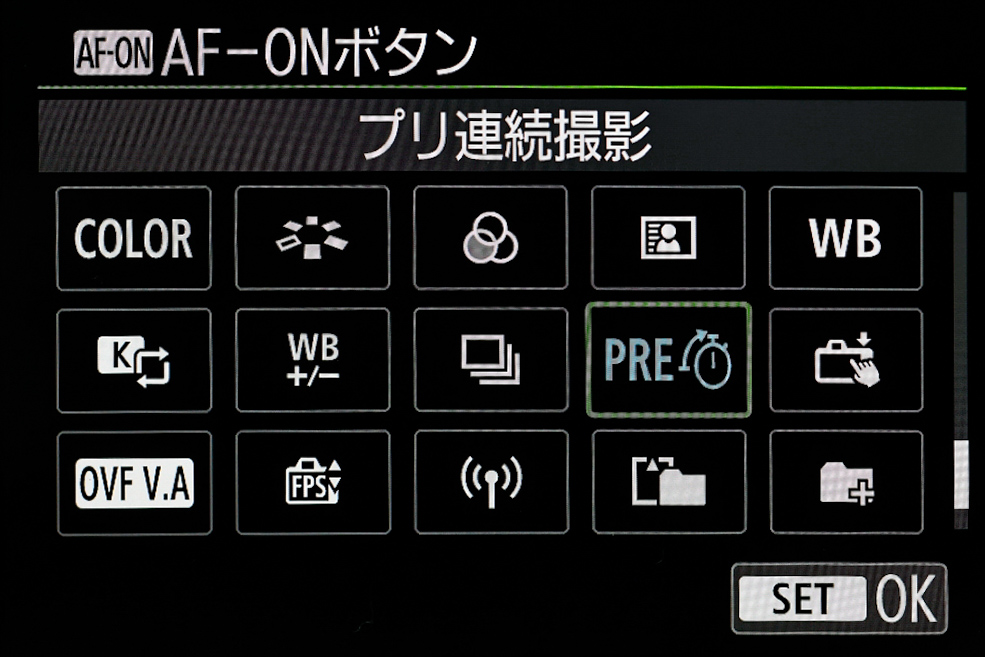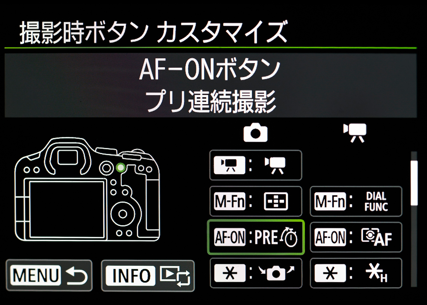 私が以前「推し」ていたAF-ONボタンでのAF操作ですが、現在の機種(R1・R5 Mark II・R6 Mark III)はAF系が劇的進化したことで、デフォルトのシャッターボタン半押しでのAFでほぼ事足りるため、私はAF-ONボタンでのAF操作をしなくなりました。そこで使わなくなったこのボタンに「プリ連続撮影」を割り当てる事で、ON/OFFを素早く切り替えることができるようになりました!他の機種もアップデートでこの機能が早く使えるように熱望しています。