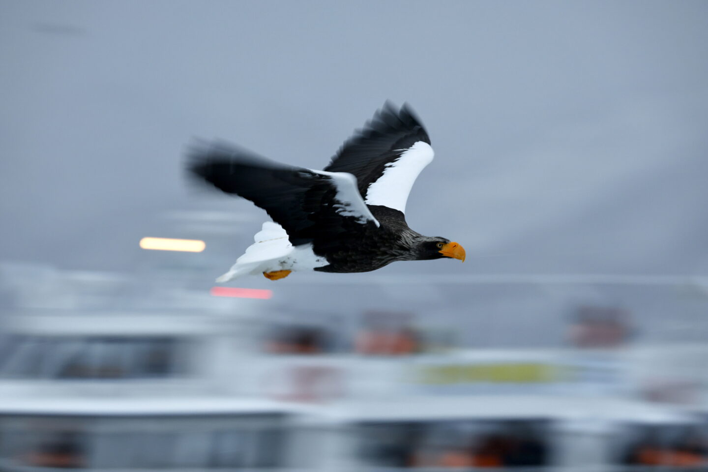 この日は天気が悪く、暗いのであえてスローシャッターで流し撮りに挑戦した。流し撮りは個人的には99%失敗するが1%の確率で成功カットが撮れればいいと思っている。この時はバックに街灯りと観光船を入れて流したシーンを撮ることができた。