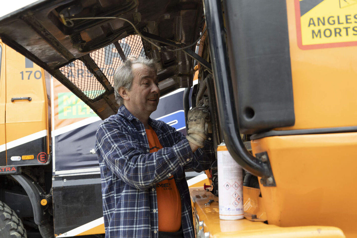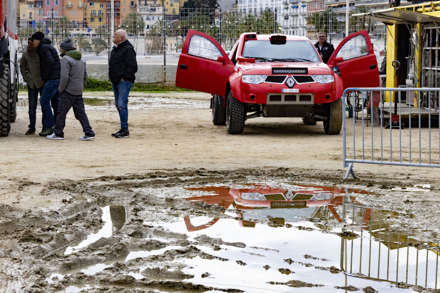 サポートの車もやはり砂漠や、岩のたくさんある凸凹道も走るのでそれなりの整備が必要です。準備をしていると雨上がりの水たまりに映った車がカッコよく見えました。泥の質感もリアルです。