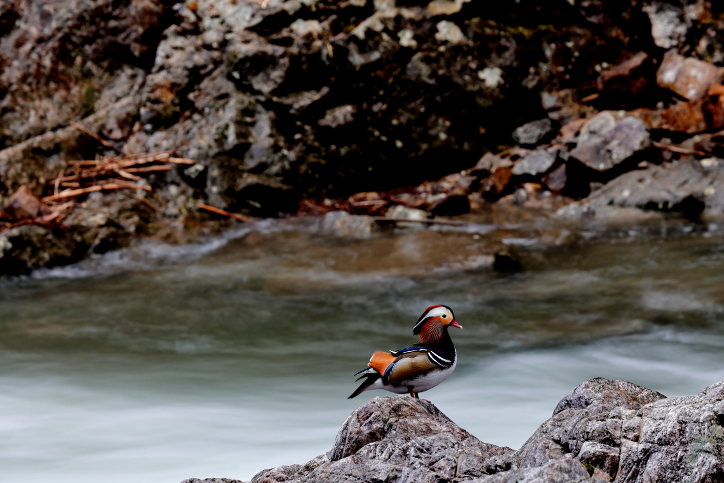 雨降りの川で岩の上でくつろぐオシドリ。NDフィルターがなかったのでF16まで絞り込みシャッタースピードを1秒まで下げた。ここでまた問題が!電子レリーズも忘れちゃったので2秒セルフタイマーに切り替え、タッチシャッターでモニターをやさしく触れてシャッターを切った。