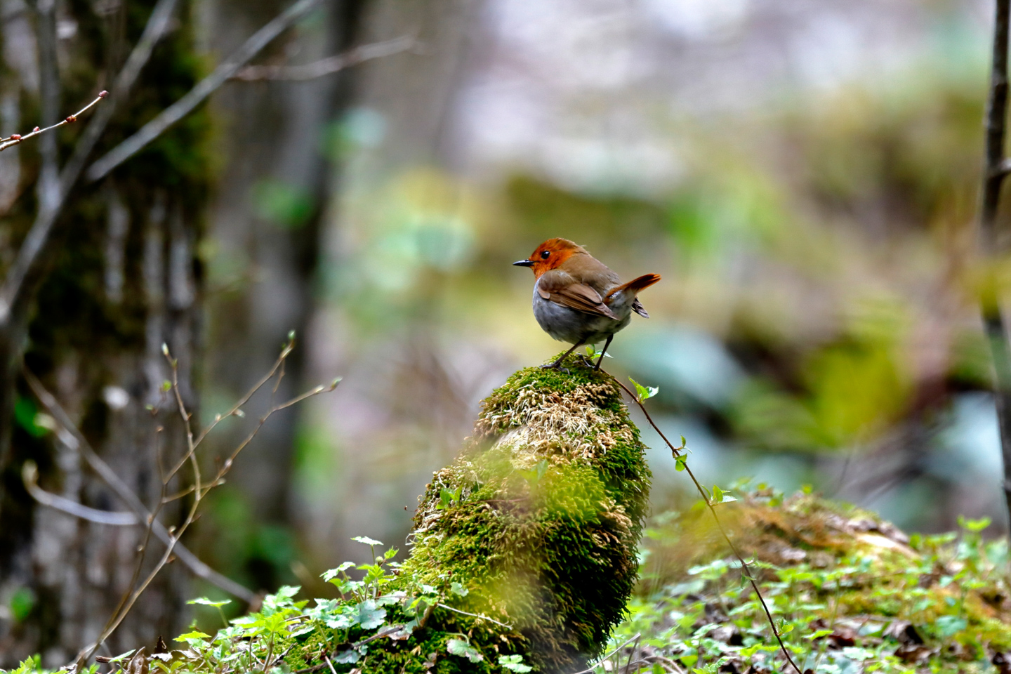 苔むした倒木の上でさえずるコマドリのオス。最近の機種は手ブレ補正が強力なので手持ちであってもかなりなスローシャッター撮影が可能だが、安全を喫して1/250秒で狙い手ブレ&被写体ブレのない撮影をすることができた。