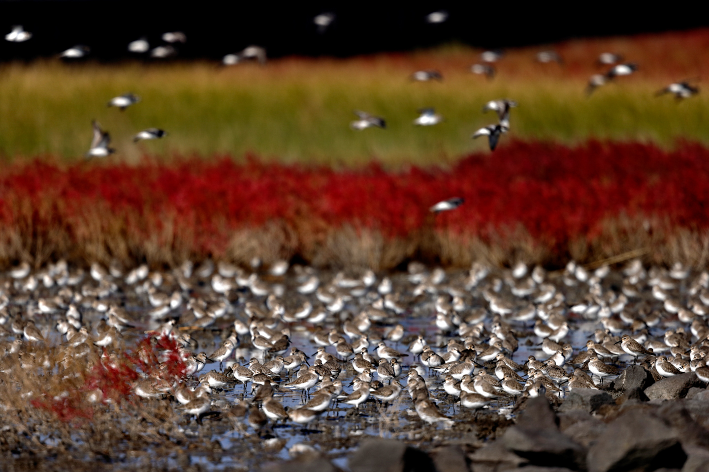 干潟に群れでとまるハマシギのバックに赤いシチメンソウを配置した。周囲を飛び回るハマシギの動きを止めるため1/2000秒という高速シャッターで写し止めた。この写真ではバックのシチメンソウをどう配置するかでアングルを決めるのに苦労した。