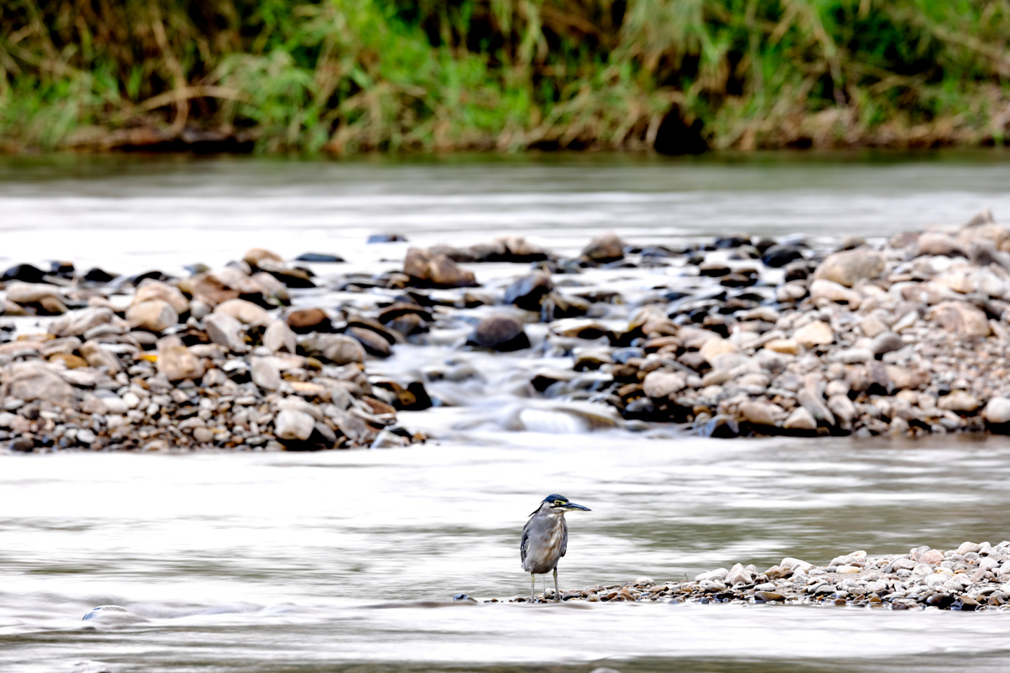 ササゴイが川の中で魚を狙う。きょろきょろと魚を探すと魚から警戒されるためじっと動かない。この状況ならとNDフィルターを使用し水面をシルキーにさせて一つの画面に「静と動」を表現できる。