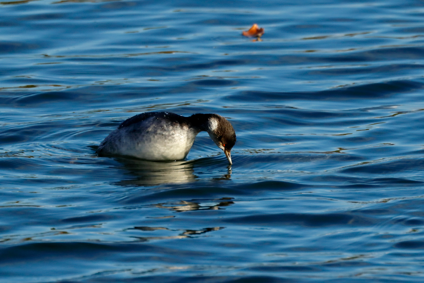 鳥がアクションを起こした後でも「アクション前」のカットを撮ることができるのがプリ連写。しかしピントを合わせ続けるAFトラッキング+高速連写が必要になる。ミミカイツブリが潜水するシーンは難しくないが嘴が水面についているところが撮りたかったので数回繰り返し、このカットがようやく撮れた。秒間40コマを使えていればもう少し難易度が下がっていたかもしれない。