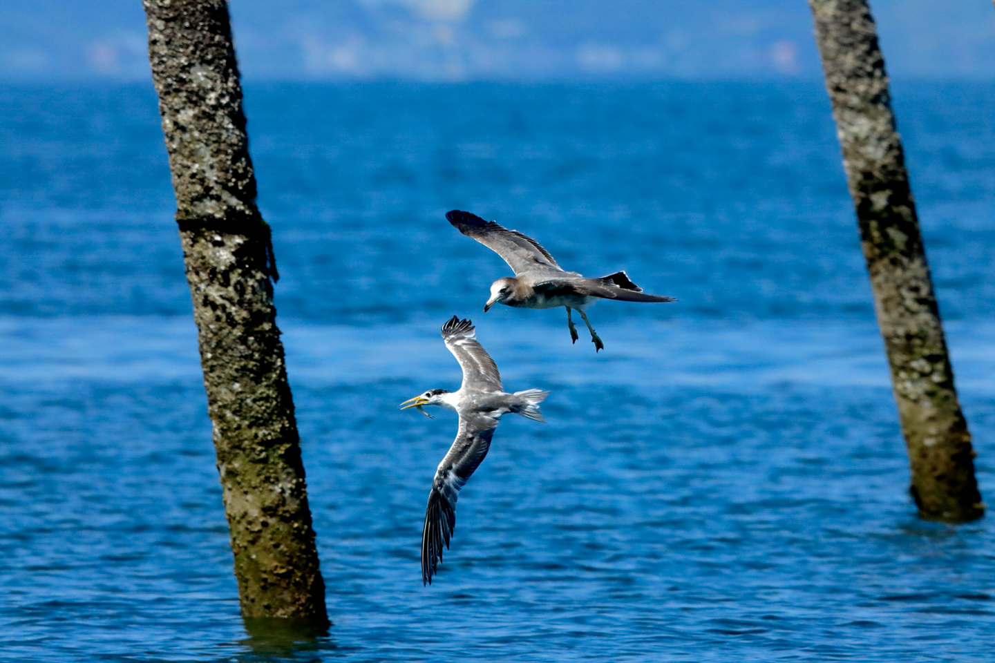 電子シャッターはブレが無く、高速連写が使える利点もあるがどうしても「ローリングシャッター歪み」が起きてしまう。しかし空バックでほとんど羽ばたかなければ問題にはならない。また高級機種になるとこの歪みは抑えられる。写真ではオオアジサシとウミネコの翼は自然だが、海から出た杭は歪みのせいで斜めになってしまった。