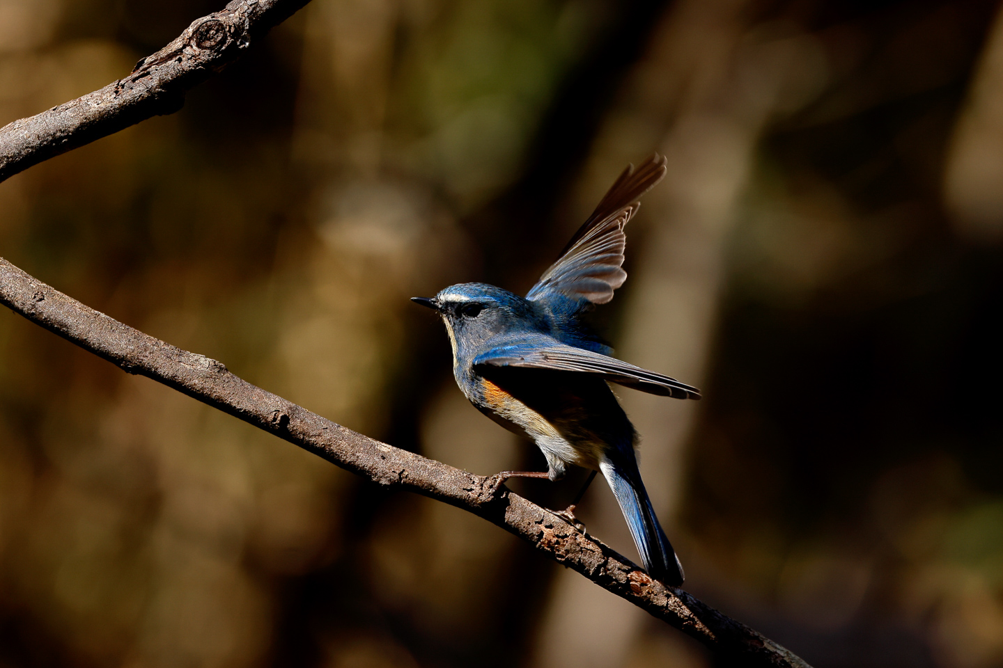 キヤノンの現行機ではR1<R5 Mark II<R6 Mark III<R7の順でローリングシャッター歪みが強く出る。上記のオオアジサシと比べるとルリビタキは飛翔していないので周囲の木の枝はとまっているが、速い翼の動きのため若干の歪みが出てしまっている。