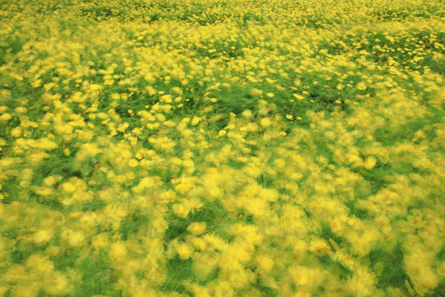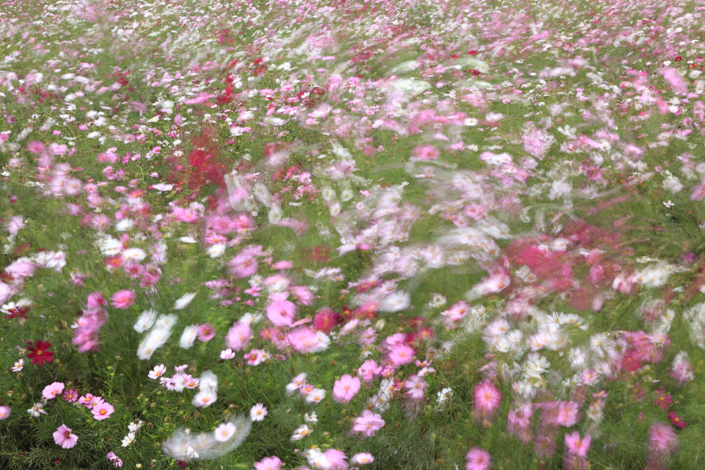 風の影響を受けやすい花、コスモス。近接撮影では風は大敵ですが、だからこそ「風を活かした表現」が可能です。スローシャッターで捉えると風や揺らぎを画面に描き出すことができます。適切なシャッター速度は、テスト撮影を重ねながら見極め、必要に応じてNDフィルターを使用します。できるだけ広範囲を捉えることで、風の強弱や通り道が写り込み、画面に動きとメリハリが生まれます。数多く撮影し、その中から動きの美しい一枚を選びます。