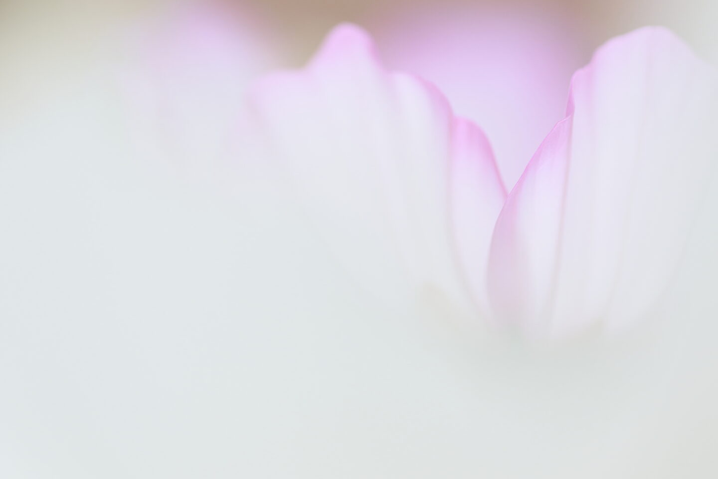 マクロレンズで、コスモスのごく一部分をクローズアップ。花を「花」として捉えるのではなく、そこに宿るラインや造形美に目を向けてみましょう。お気に入りの品種ピコティ。花びらの内側に、さらに小さな花びらが隠れていました。最短撮影距離まで寄り、その一角を切り取ると、やさしいピンク色の造形がふんわりと浮かび上がりました。マクロレンズだからこそ捉えられる花の奥に広がる「ちいさな世界」です。