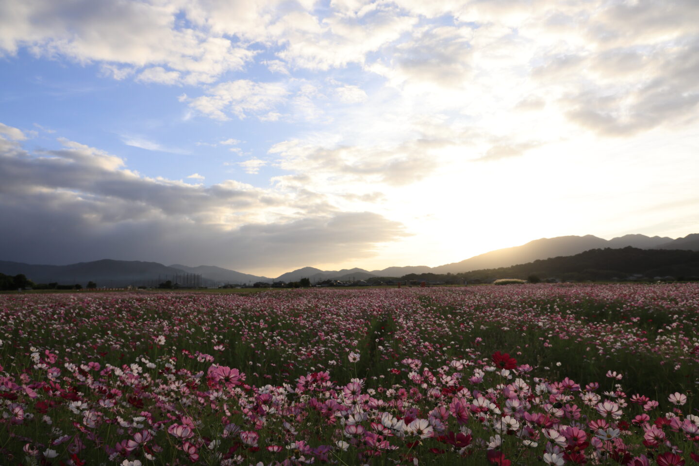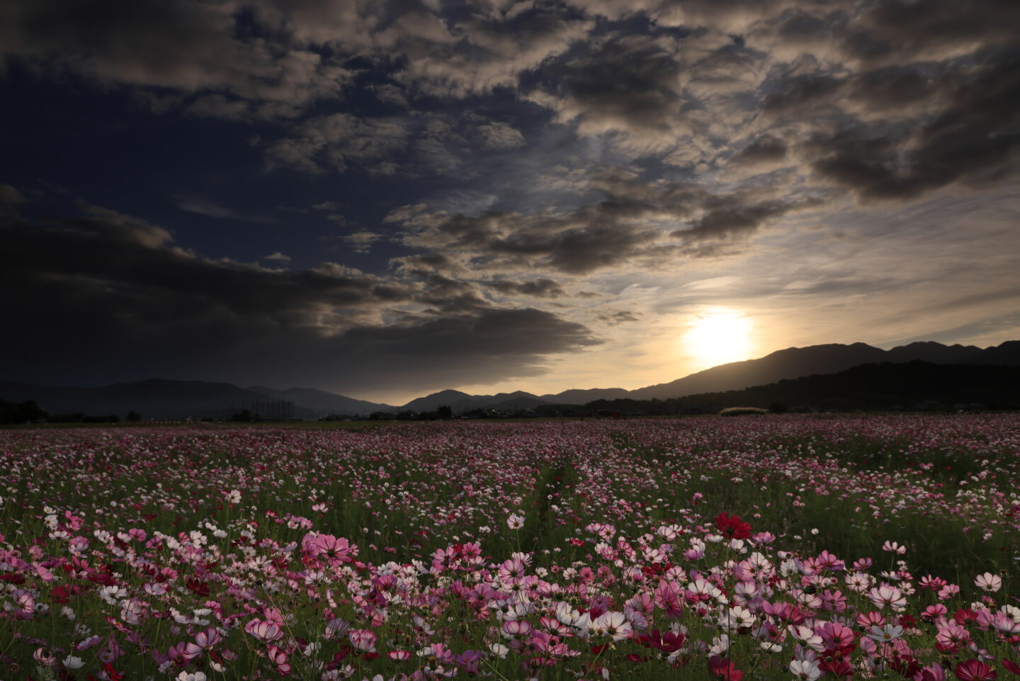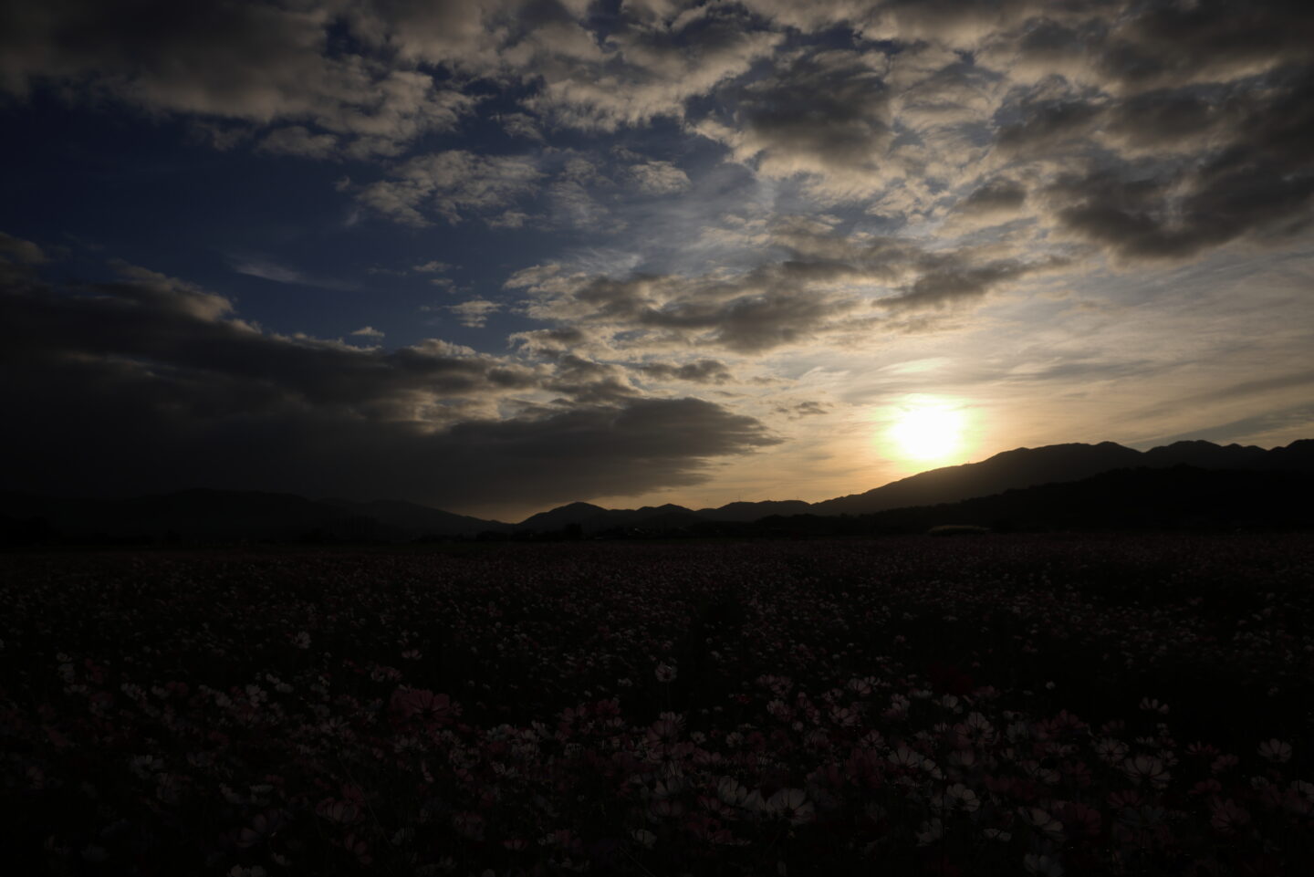 写真の難しさは、目で見た通りに写ってくれないこと。明暗差のある光景──たとえば朝日が昇るシーンでは、空とコスモス畑の両方を美しく表現するのは容易ではありません。畑の質感を優先すると空が白く飛び、空の表情を重視すると畑が暗く沈んでしまう。そんなときは、露出のバランスを整えるハーフNDフィルターの出番です。明るい空と暗いコスモス畑、それぞれの魅力を引き出しながら、自然な階調で一枚に収めることができます。