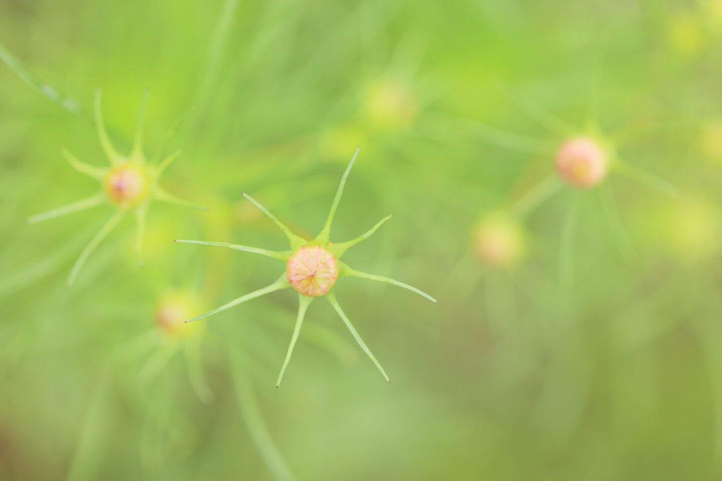 綺麗に咲いている花に目を奪われがちですが、コスモスはつぼみもまた可憐です。訪れたコスモス園が、まだ見頃には少し早かった…。そんな時こそ「宝もの探し」の気持ちで、愛らしいつぼみを探してみてはいかがでしょうか。咲く前の静けさの中に、命の予感がそっと宿っています。俯瞰で捉えることで放射状に広がるガクの美しさを際立たせました。つぼみの配置にも気を配り、画面の中でバランスよく切り撮ることで、静かな造形美を引き出しています。