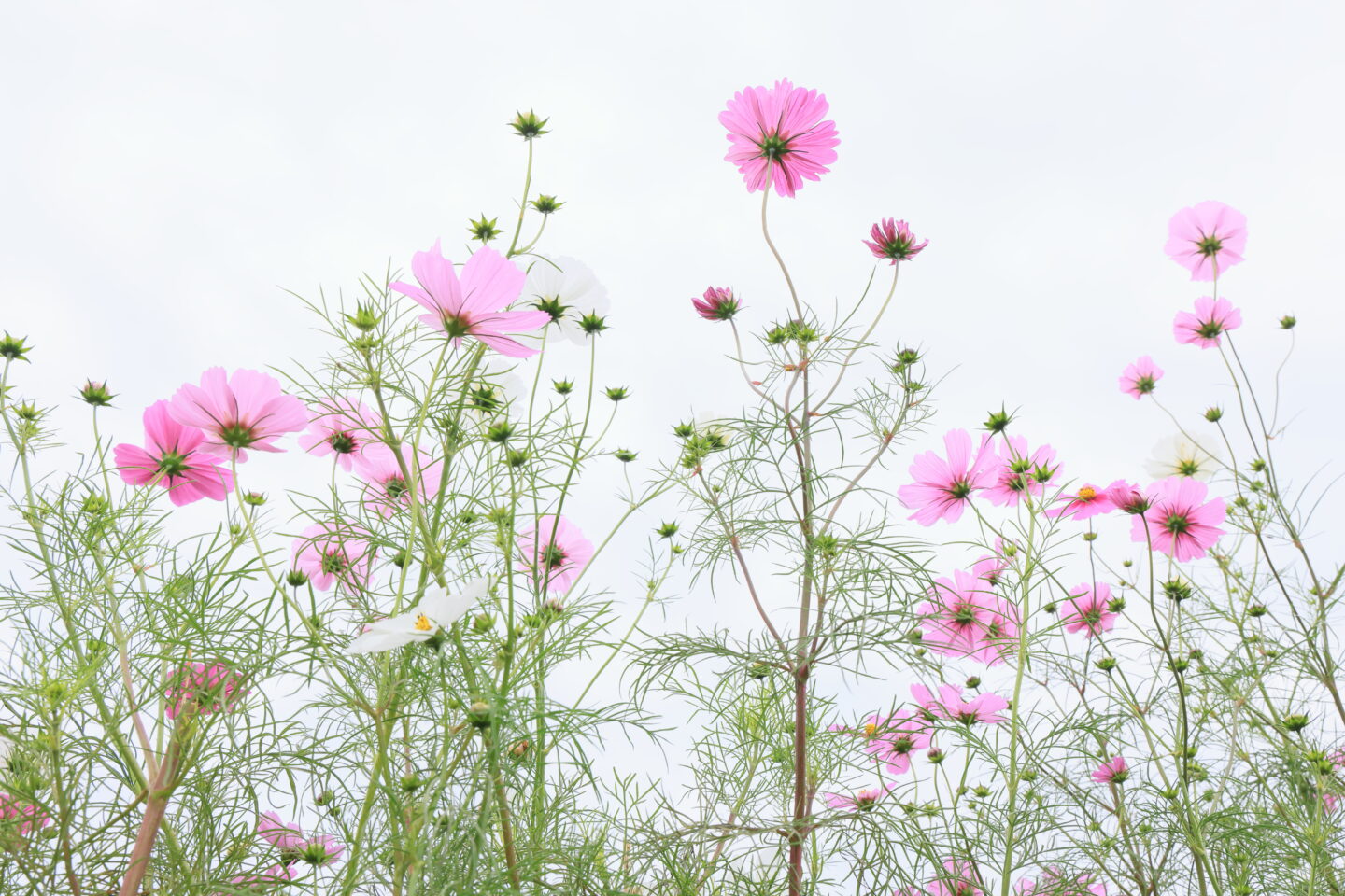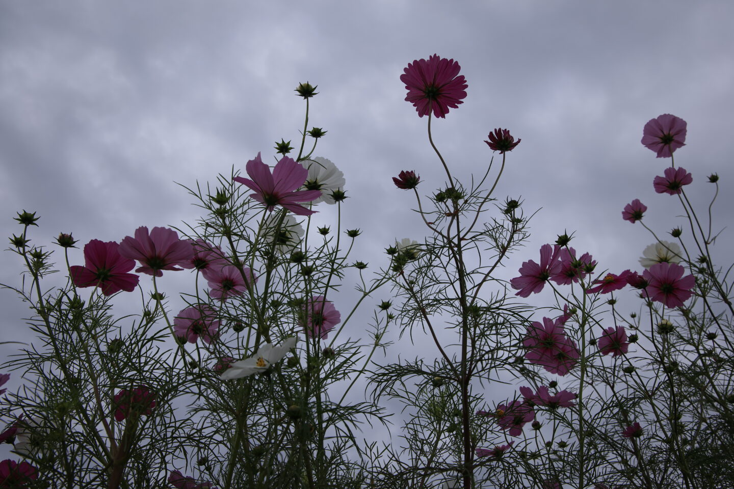 曇り空の日は写欲が湧かない──そんな声も聞こえますが、曇天には曇天にしか撮れない写真があります。空を画面に入れると寂しい印象になりがちですが、構図を工夫し、淡い色のコスモスを選び、プラスの露出補正をかけることで、やさしいハイキー調の世界が広がります。柔らかな光が花の質感を引き立て、晴れの日には見過ごしてしまう静かな美しさが浮かび上がります。曇りの日こそ、光と色の繊細な対話を楽しむ絶好の機会です。