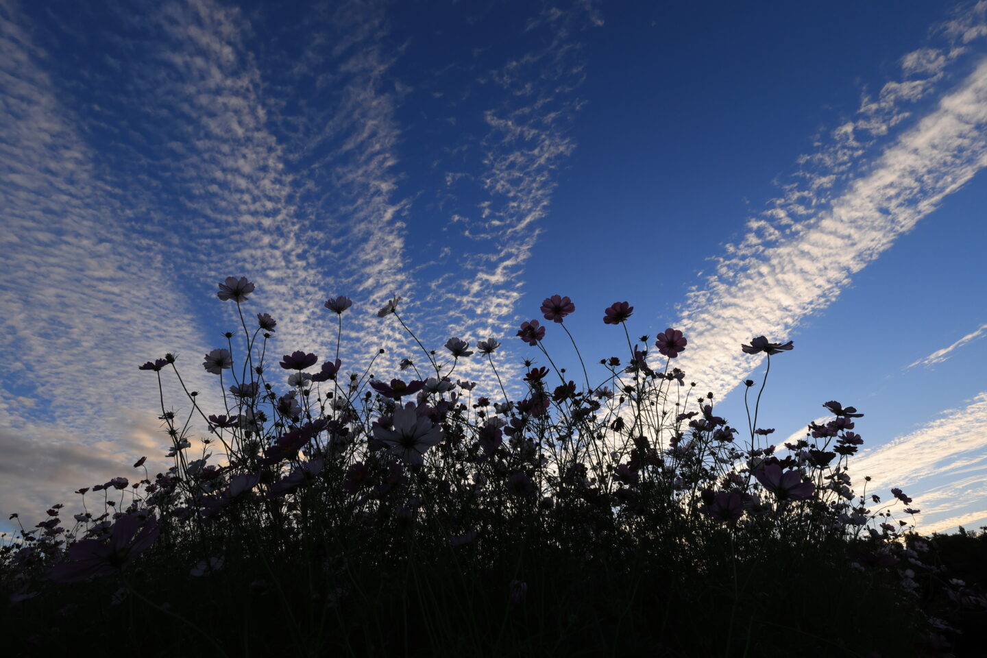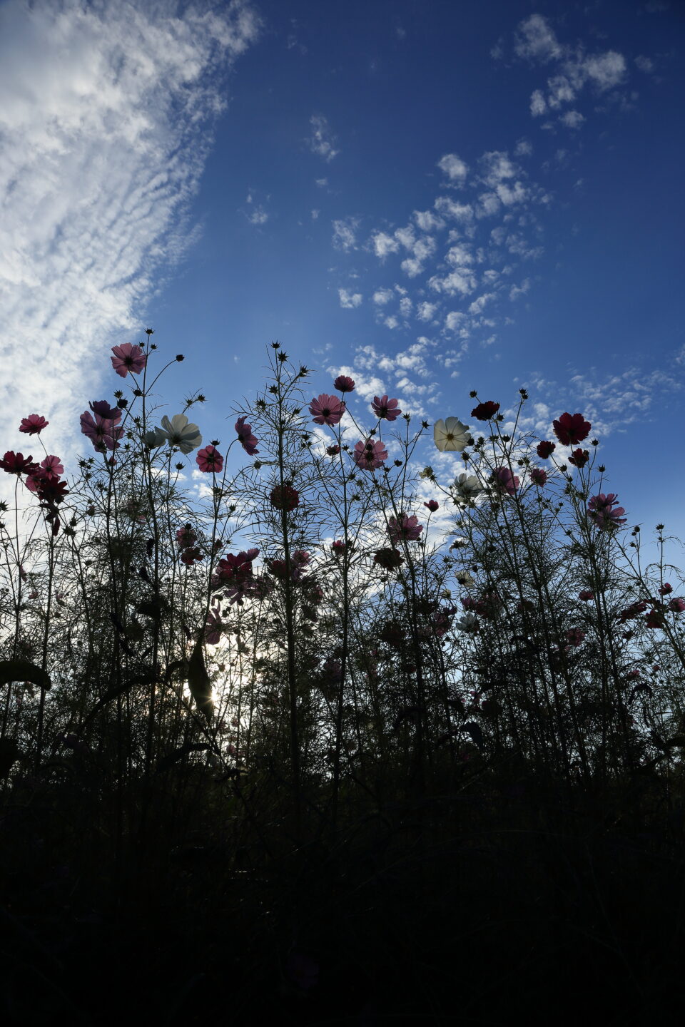 秋の夕暮れ、空は刻々と表情を変え、雲はその瞬間ごとに異なる美しさを見せてくれます。そんな魅力的な空が広がっていたら、積極的に画作りに取り入れてみましょう。コスモスをシルエットで捉えることで、作品に新たなバリエーションが生まれます。