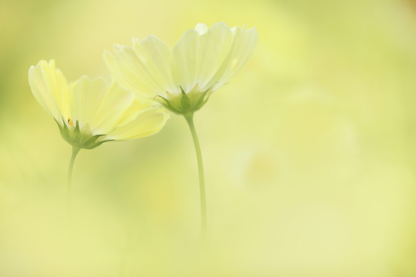 やさしい黄色のコスモス、イエローキャンパス。望遠レンズで捉えると、柔らかな色調の中に、寄り添う二輪の花がふんわりと浮かび上がりました。絞りは開放。前ボケと後ろボケには同系色を選び、画面全体をやさしい色で包み込むことで、統一感のある穏やかな印象に仕上がります。曇天の下での撮影も、この写真の雰囲気を決定づける大切な要素。直射光のない柔らかな光は、花の質感と色調を損なうことなく、静かな美しさを引き出してくれます。