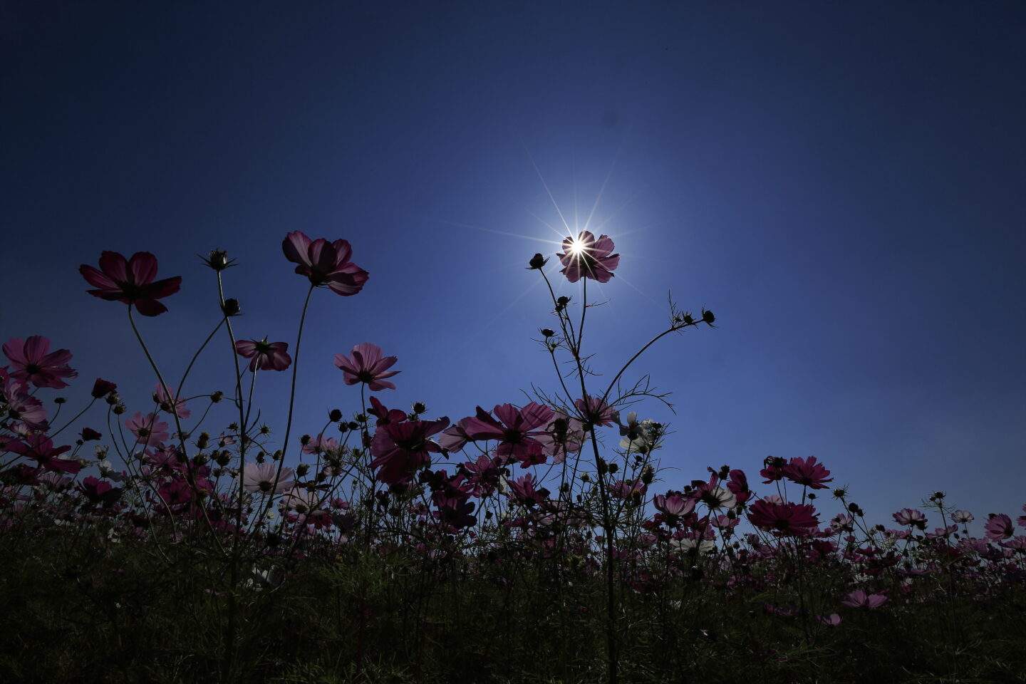 晴れた日には、晴れた日だからこそ撮れる写真を楽しみます。そのひとつが、コスモスと太陽を重ね、光条をアクセントにしたシルエット描写。シルエットでの表現ですから、できるだけ重なりのない花を探すことが肝心です。絞りを絞り込むことで、太陽は光条を放ちます。花びらの隙間から太陽を少しだけ覗かせるのがポイント。光学ファインダーでは眼を傷める恐れがあるため、背面の液晶画面で構図を決めましょう。
