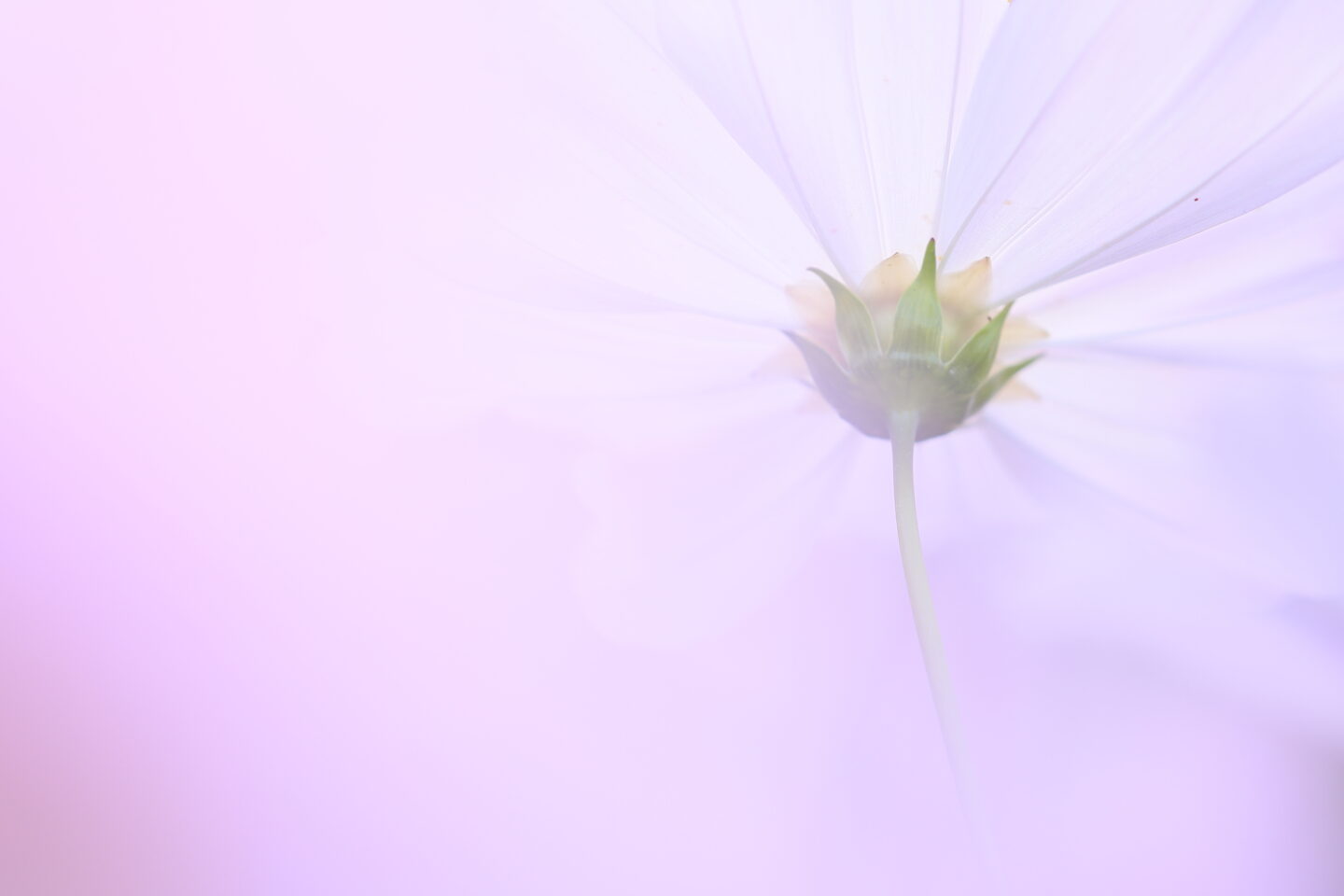 コスモスの花を「コスモスらしく」捉えるだけでなく、さまざまな角度から見つめることで、作品の表現は、ぐっと広がります。花の裏側にある「ガク」に目を向けてみると、そこにもコスモスならではの可憐さが宿っていました。花の輪郭を画面に入れてしまうと、どうしても「花」としての印象が強くなってしまいますので花の輪郭はあえて画面から外し、前ボケを添えることで、やさしいピンク色の中に緑色のガクが浮かび上がりました。